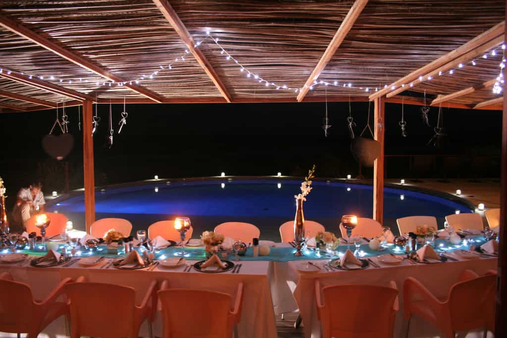 On the one end of camp, you'll find the main restaurant (three delicious meals a day are included) and a lovely wooden viewing deck. Several tables and chairs are shaded by umbrellas, and make an idyllic dining spot, accompanied by ocean views. There's a smart bar next door, and the lounge and library are a peaceful spot to put your feet up with a good book. But maybe the choicest spot to hang out (besides the beach, of course) is the huge pool on the other side of hotel - just a few steps from the sand, surrounded by palms and recliners, and with its own bar.