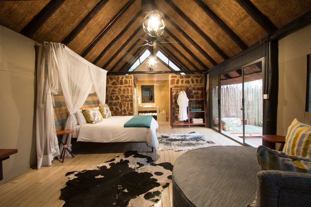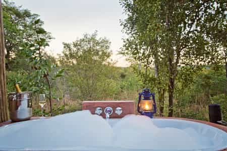 Nine Wilderness Tents of thatch and canvas are perfect for couples, with king or twin-bed configurations. Charming and comfortable, they have furnished decks and spacious stone bathrooms. The thatch-and-stone Hide-Away Suite caters for all romantics, with its outdoor bathtub for two. Travelling with kids? The double-storey Family Nest has a master bedroom and private lounge (with fabulous views) upstairs, and another en-suite bedroom, common living area and kitchenette on the lower floor. Outside is a private plunge pool and BBQ.