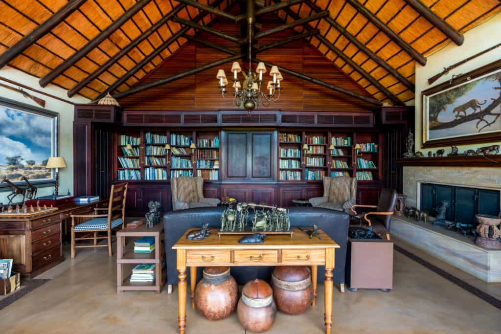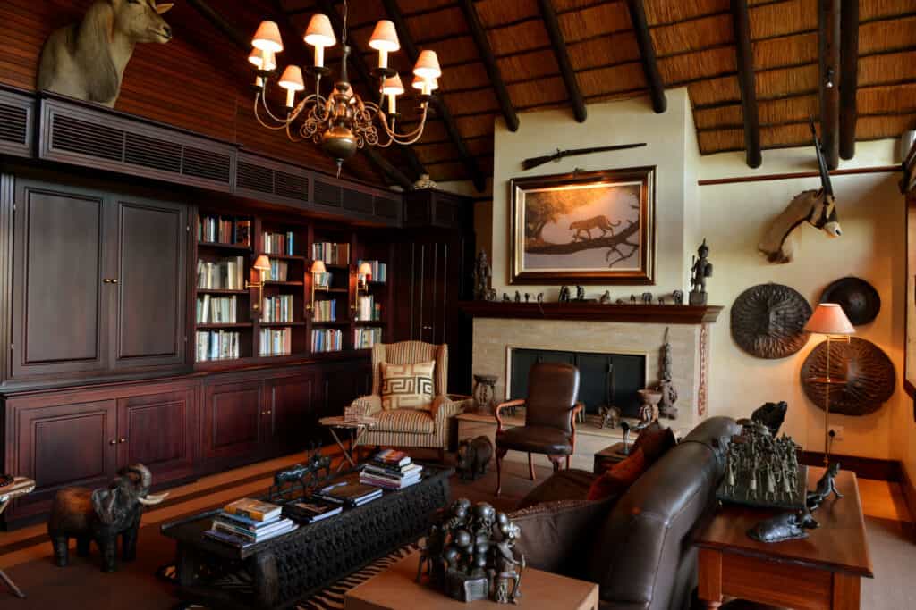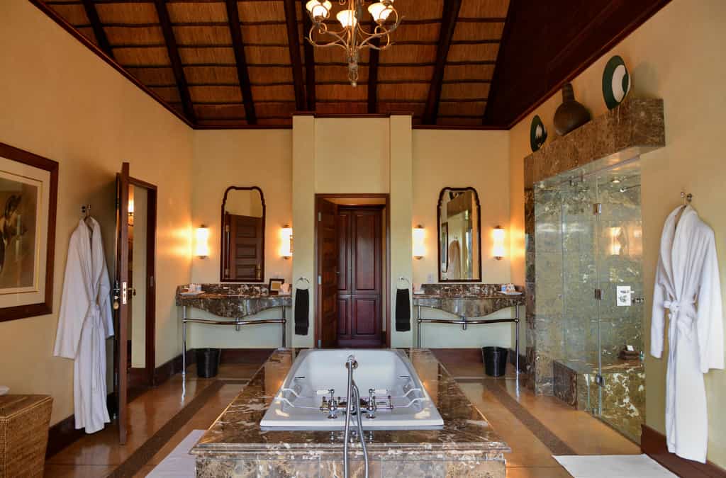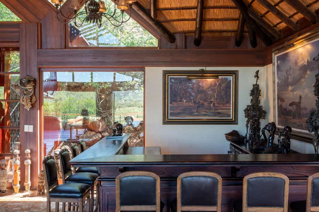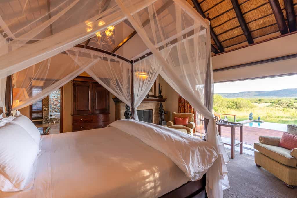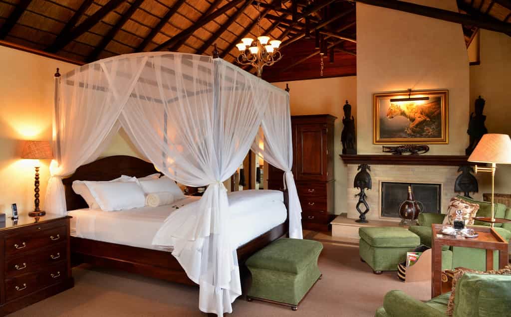 Five vast private suites radiate out from the main lodge along a rocky ridge, each with original African artworks, hand-crafted mahogany furniture, and lavish en-suite bathrooms with a vast central tub, elegant indoor shower and secluded outdoor shower. Luxury is top notch, with romantic four-poster beds under high thatched ceilings, a beautiful fireplace, airconditioning, and a mini-bar. A natural window sala opens onto the private deck and rim-flow plunge pool, with views over the waterhole and the surrounding wilderness.