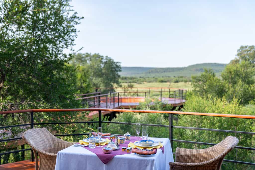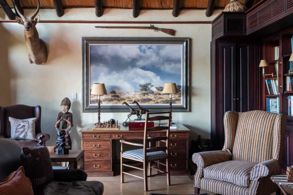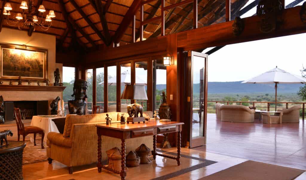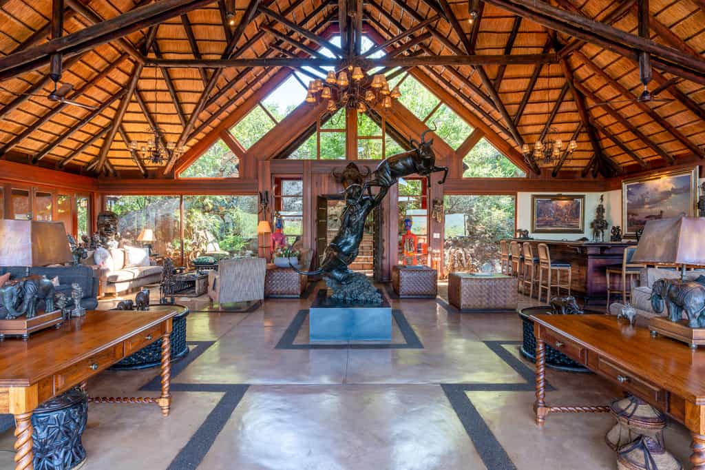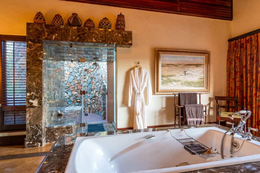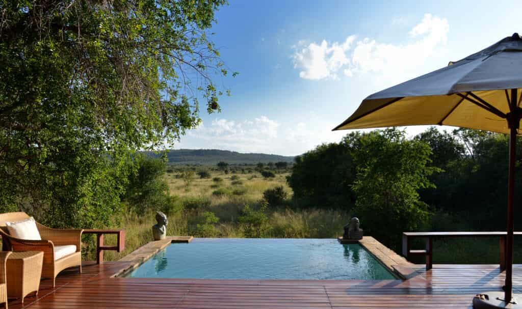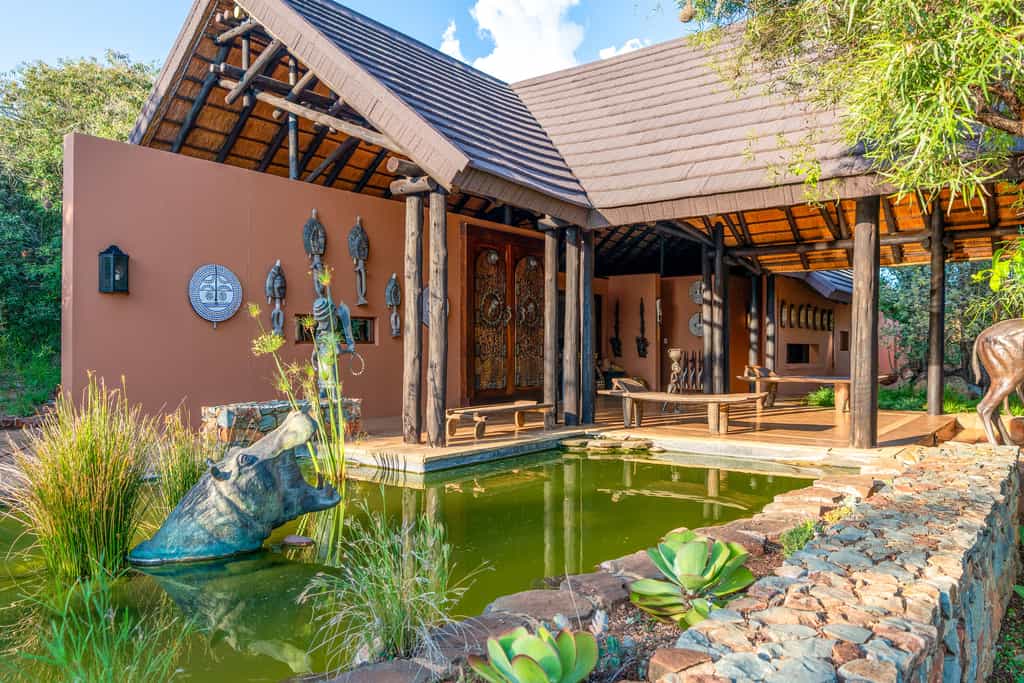 Five vast private suites radiate out from the main lodge along a rocky ridge, each with original African artworks, hand-crafted mahogany furniture, and lavish en-suite bathrooms with a vast central tub, elegant indoor shower and secluded outdoor shower. Luxury is top notch, with romantic four-poster beds under high thatched ceilings, a beautiful fireplace, airconditioning, and a mini-bar. A natural window sala opens onto the private deck and rim-flow plunge pool, with views over the waterhole and the surrounding wilderness.