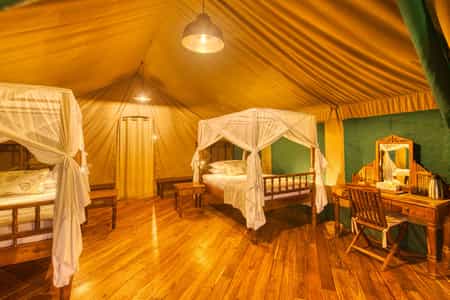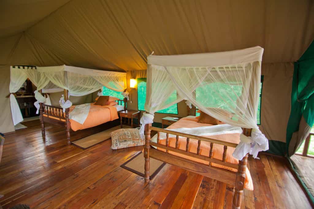 Eight safari tents, including a larger version for a family, are raised on wooden platforms. Built of canvas with packed-thatch roofs, their interiors feature dark-wood furnishings and polished floors – the atmosphere is homely, if a little minimalist. But everything you need has been provided, from glassed-in showers, double basins and flush toilets to the small shaded verandas, each with a twin-seater sofa. The family room sleeps four comfortably, with the potential to add an additional bed or two.