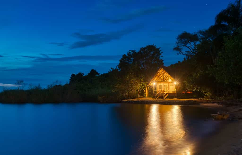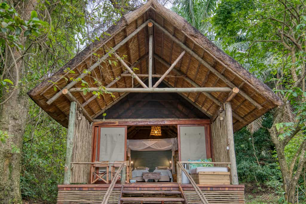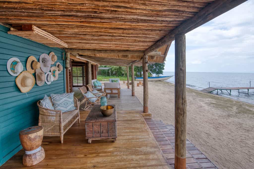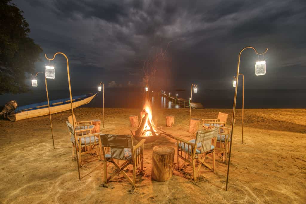 Tucked into the lush trees sit ten luxury canvas safari tents, perched on raised wooden platforms above the sandy lake shores.King sized Zanzibarian four poster beds draped with light cotton sheets and mosquito netting add a lovely layer of safari comfort.Furnishings are simple and light, the triple room perfect for families. Sleeping on the edge of the forest canopy sitting on your deck looking out over Lake Tanganyika, the rustling of monkeys and birds all around you, is sheer bliss.