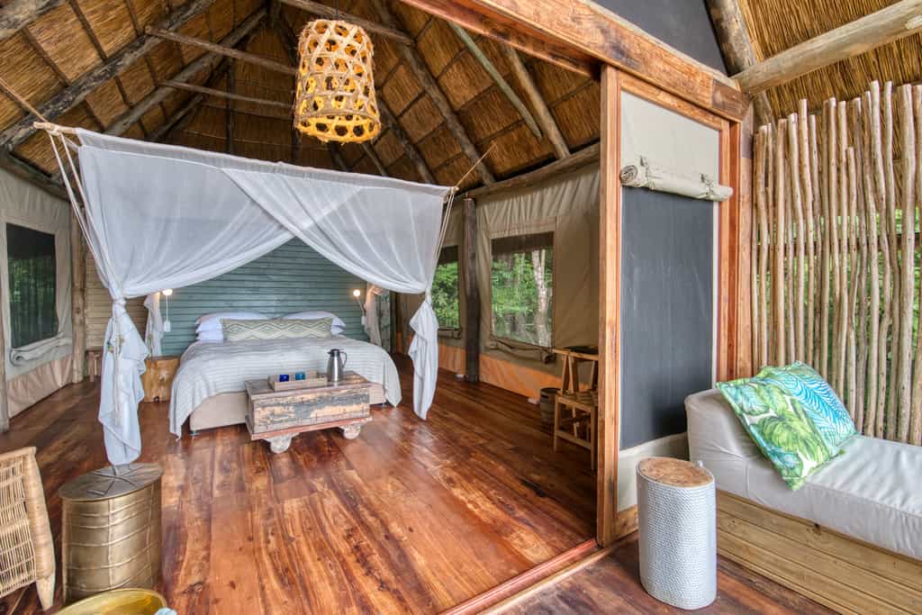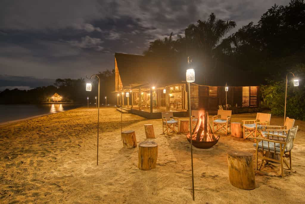 Shaped like the bow of a traditional dhow boat the open sided thatch mess tent serves as and communal dining area.A wonderfully eclectic space to pass away the hours decorated with locally crafted wooden furnishings and earthy tones.Dining and sundowners often take place on the shores of the lake around beach fires and romantic hurricane lanterns.There are sun loungers and umbrellas set out along the beach shore for those that want to sit back and take in the wild surrounds.