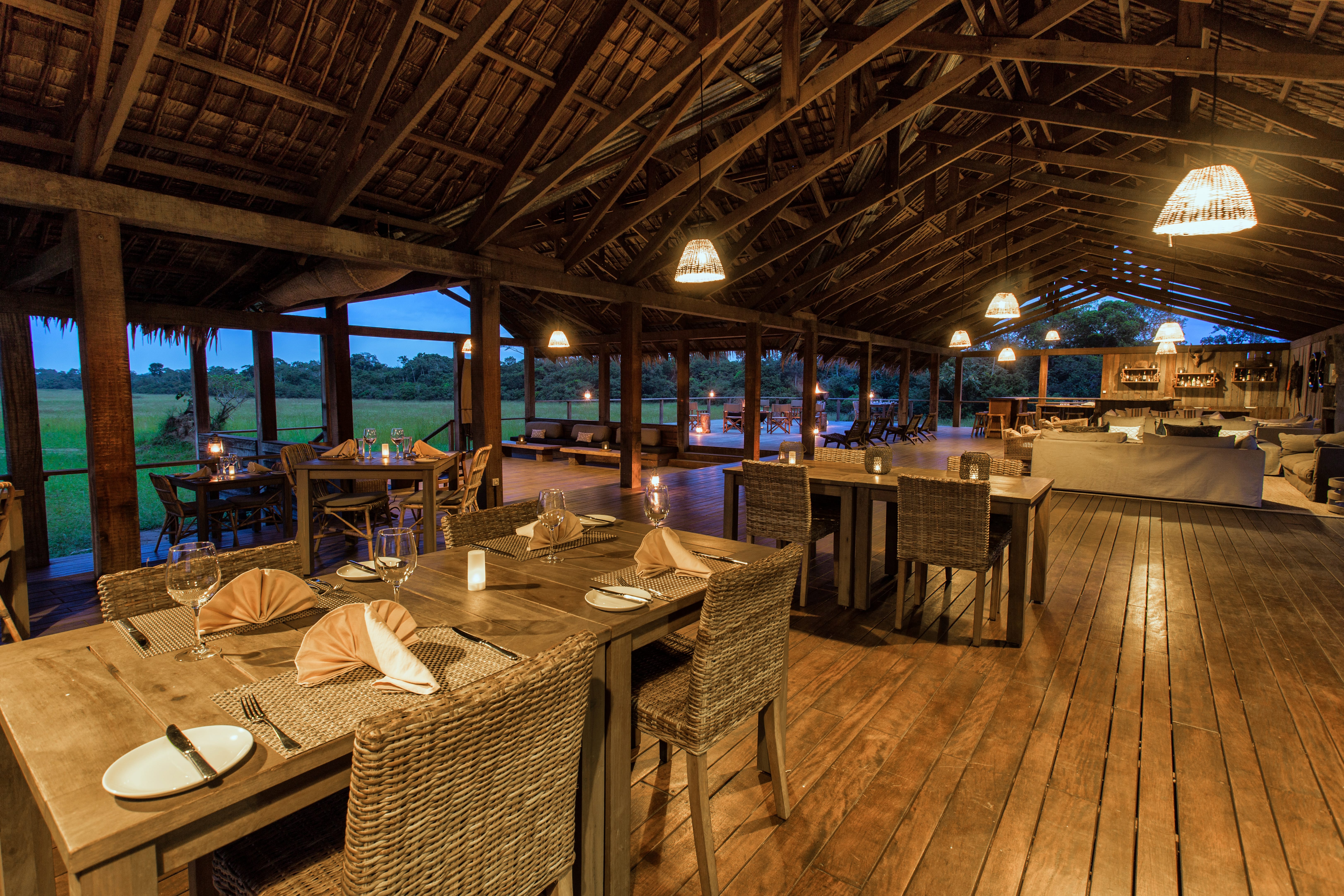 The lounge, dining room and bar sit in the middle of a large grassy clearing. Elevated and open-sided, the thatched area has 360 degree views of the forest, plains and river from plenty of plush couches and padded bench seats. To one side, there's a lovely bar area with a stylish wooden counter top, and on the other is the dining room, where home-cooked fare is served for lunch and dinner. There's another spot down by the river with a bar and a few chairs that's perfect for an evening drink, and the wooden viewing deck hosts an impressive brass fire pit at its centre.