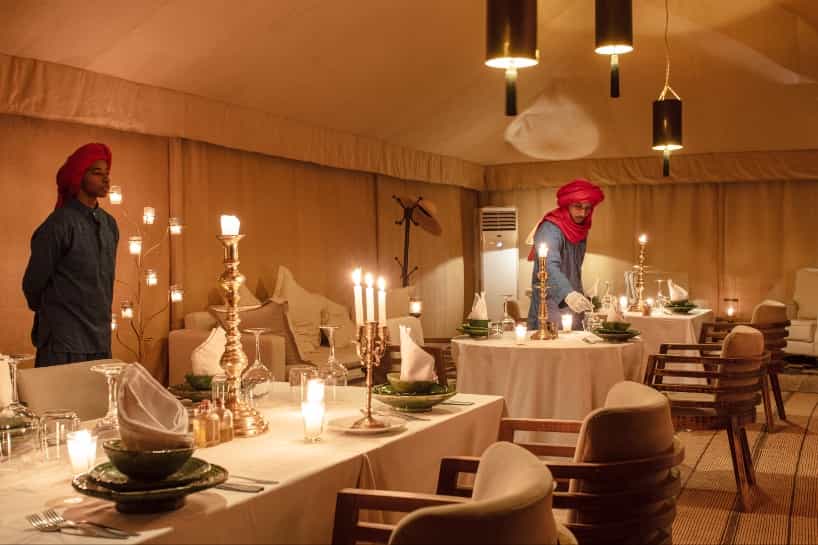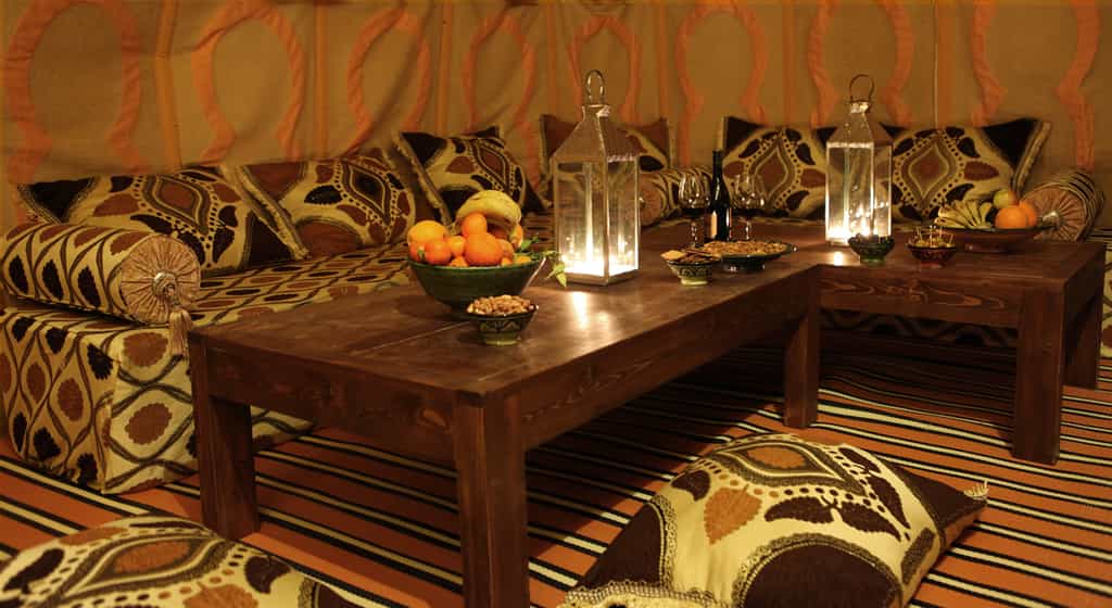 At Merzouga, the desert is your dining room, lounge and playground. You'll enjoy breakfasts of fresh fruit juice, yoghurts and Berber crepes on top of a dune, afternoon tea, picnic style, on the sand, and dinner under the stars, each course chosen by you. Later on, rousing musical show of Berber and Nomadic tunes, is played around the fire. There is also a tented dining room, adorned with tree-like candelabras and plush white couches, and the cuisine could easily rival Marrakesh's finest.