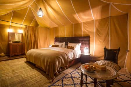 Plucked directly from a scene from Lawrence of Arabia, there are 15 peaked tents set amidst the Znigui dunes. The style is cosy, authentic and laidback, with Berber textiles, huge ceramic vases, and woven baskets all featuring. Tents are surprisingly roomy and come equipped with a flushing toilet, piping-hot shower, air-con, and ports for charging your phone. Set around a central area, the tents aren't especially far from each other, and if privacy is important, choose the glass-fronted exclusive camp, a little further away.
