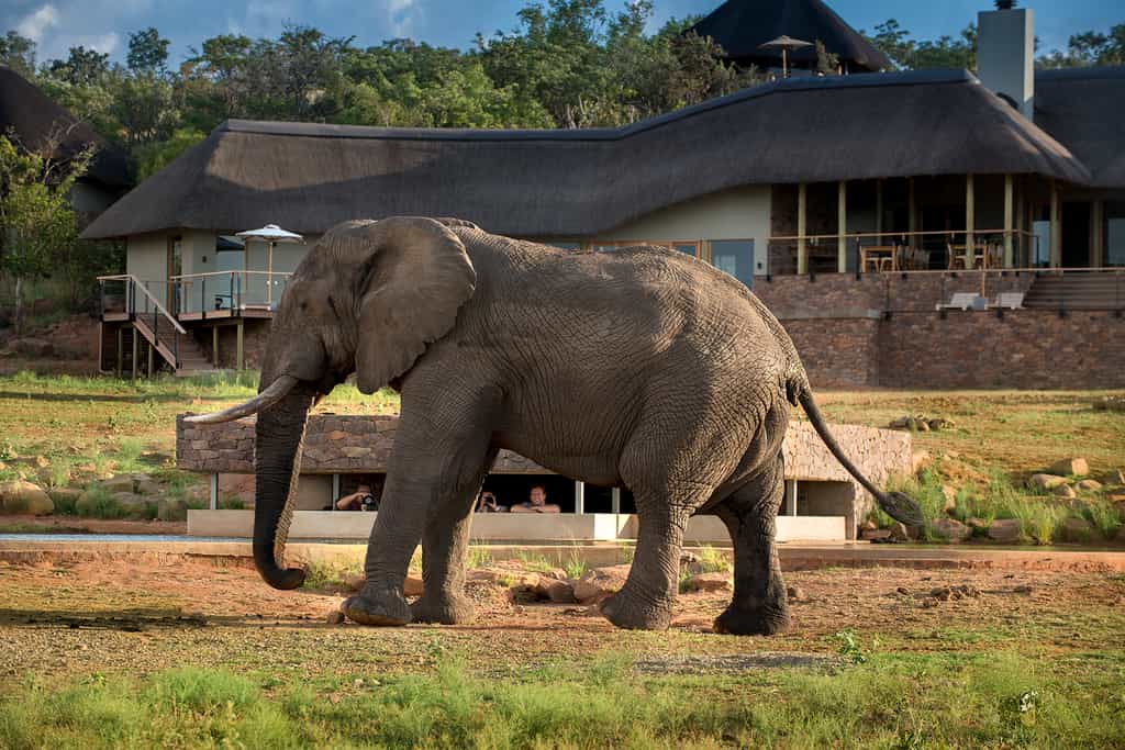 The underground waterhole hide. A 65-metre tunnel leads from the lodge to an eye-level viewing spot – grab a coffee, settle in and watch elephants drink just metres away.