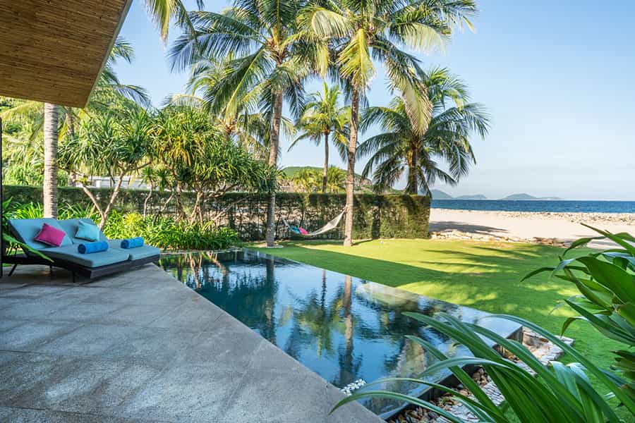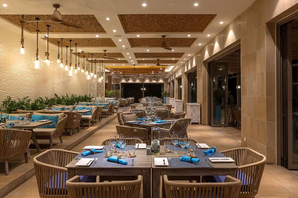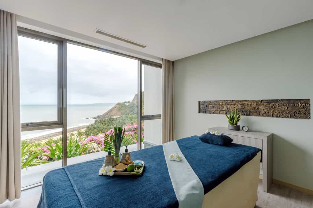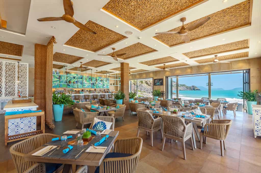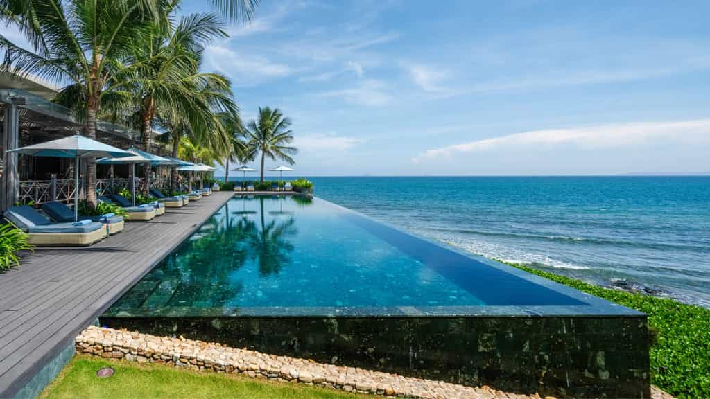 Perched between cliff and coastline, the communal spaces are as minimalist as they are striking. The poolside Sandals restaurant serves up fresh seafood and Vietnamese specialities alongside Western favourites, with floor-to-ceiling windows framing uninterrupted sea views. For something more intimate, La Baia specialises in Italian fare – impressive considering the distance from Rome. Mojito's bar, true to its name (and the resort's namesake sugarcane), mixes creative cocktails from a clifftop perch with sunset views that'll make you linger longer than planned. The Ô Spa uses organic ingredients like locally-sourced coffee beans and lemongrass for treatments, whilst the infinity pool – flanked by palm trees and sunbeds – seems to pour straight into the South China Sea.