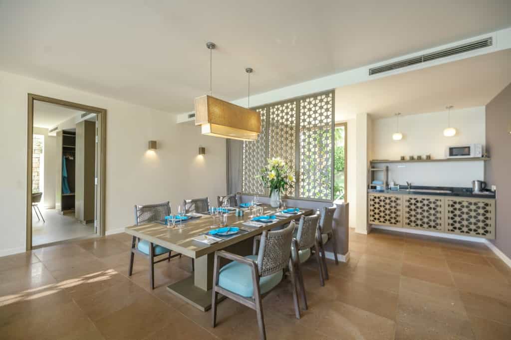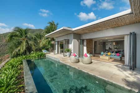 Split between ground-level villas and cliff-edge perches, the 80 rooms and villas favour clean lines and natural materials over fussy decoration. Think four-poster beds draped in white linens, boulder-effect accent walls, and spa-like bathrooms with both indoor rain showers and outdoor alternatives for proper tropical indulgence. The condos offer generous terraces (some garden-facing, others with ocean panoramas), whilst the villas up the ante with private infinity pools, separate lounge areas, and hammocks strung between the palms. All feature those distinctive grass roofs that provide natural insulation, keeping things cool without the constant hum of air-con. The larger five-bedroom residences work brilliantly for groups or extended families wanting ample indoor and outdoor space.