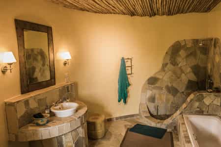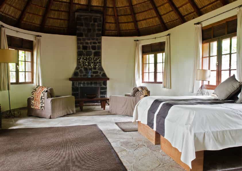 Fashioned from local lava stone, wood and thatch, the 12 eco-chic bungalows are big enough to house an entire gorilla family and come complete with outside terraces, mini-sitting areas and sizeable beds. Soft tones, sleek furniture and large glass windows keep things light and bright during the day and the log fire is a welcome addition in the evening. Ensuite bathrooms are just as spacious and you can choose between an enormous stone tub or vast shower to wash off the day’s dust.