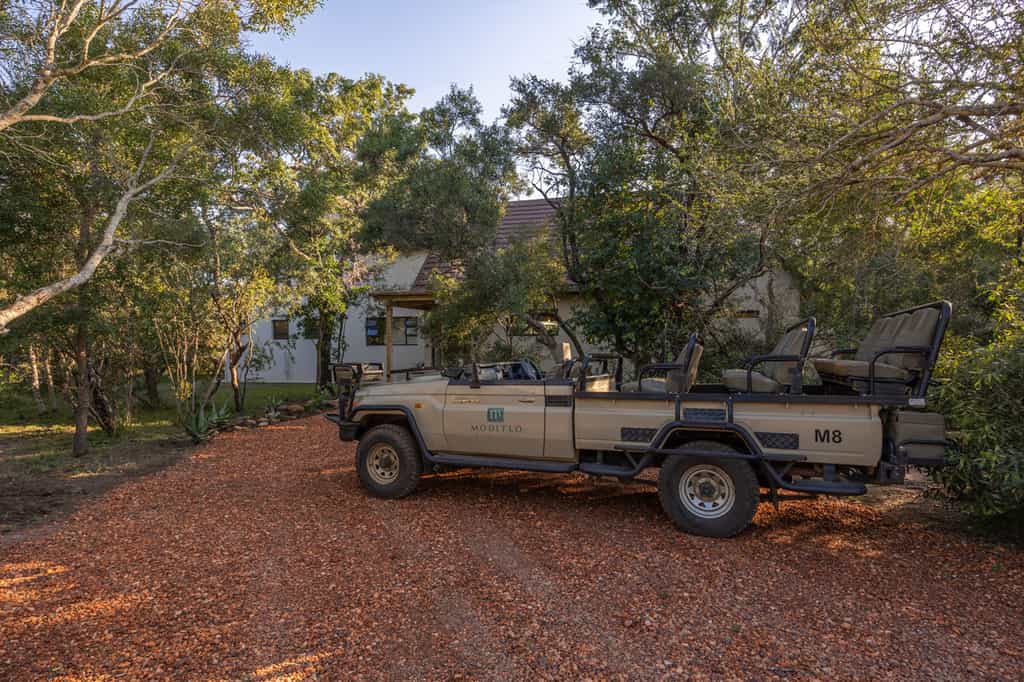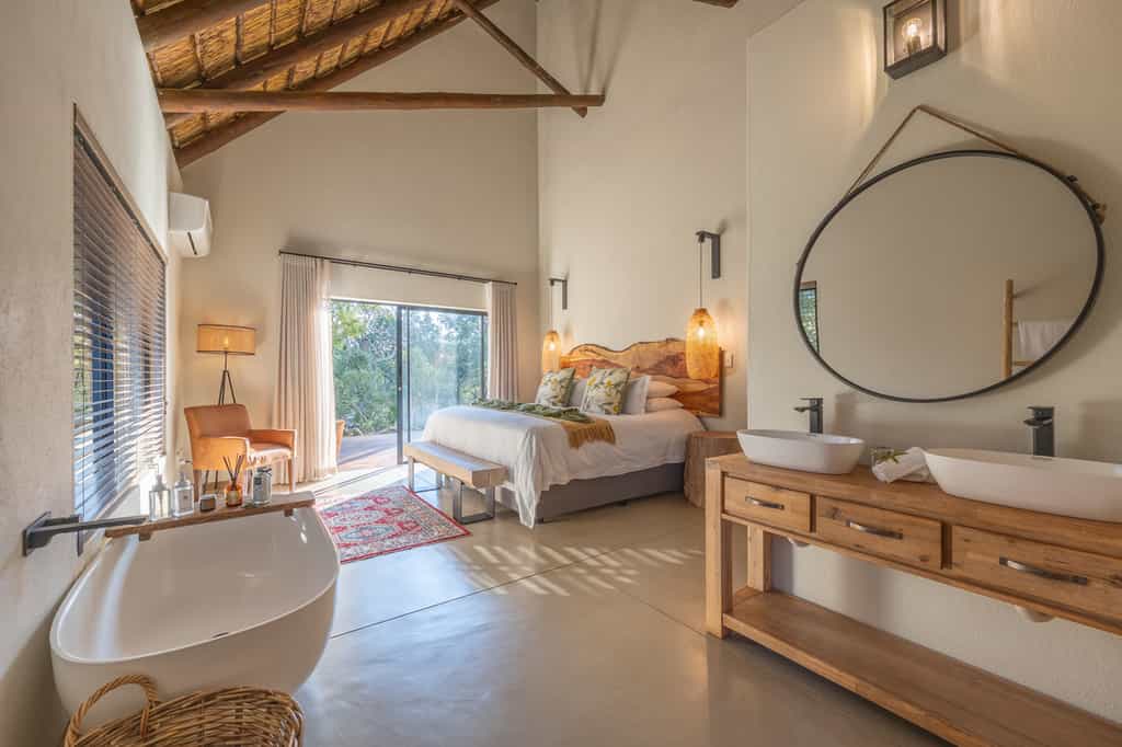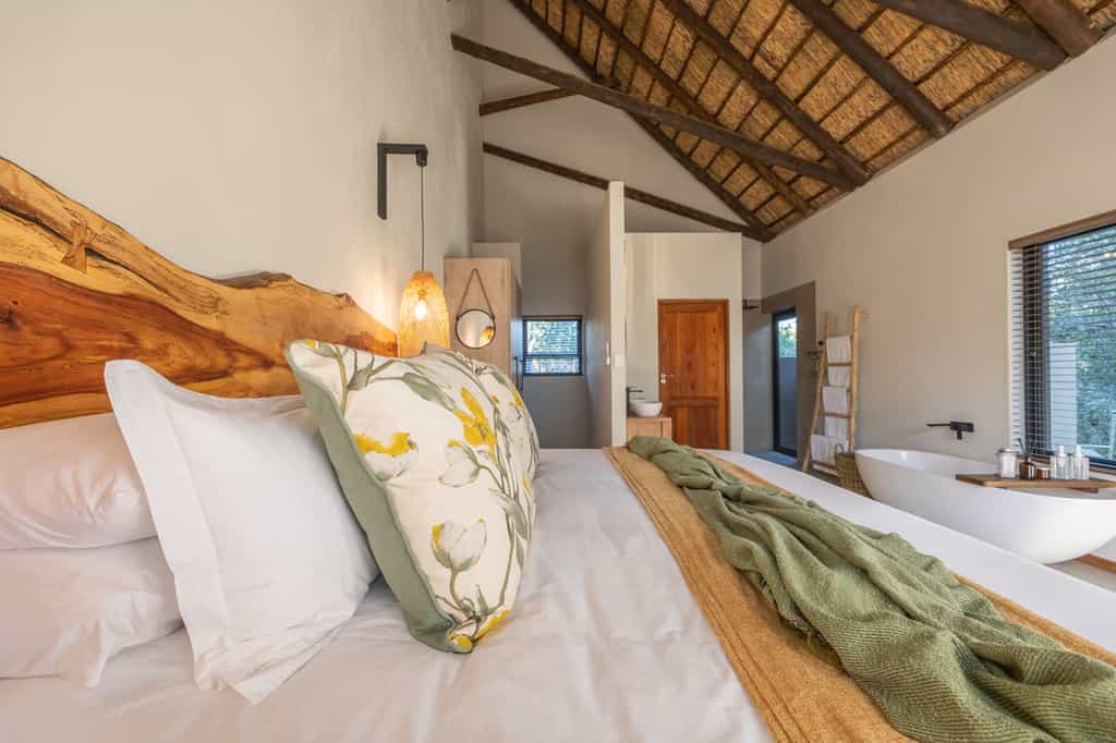 There are 18 rooms along Moditlo's winding walkways. Large beds are draped in Percale linens and fuzzy grey throws, and wide windows let in a stunning sunrise view. The open-plan bathrooms have shuttered wardrobes, organic toiletries, and a freestanding tub and separate shower, perfecting for gazing out over the bush. The mini bar is well-stocked and there is a coffee station for morning brews on the private patio, or in some cases, the cosy sitting area.
