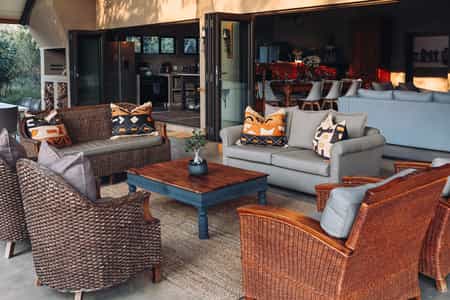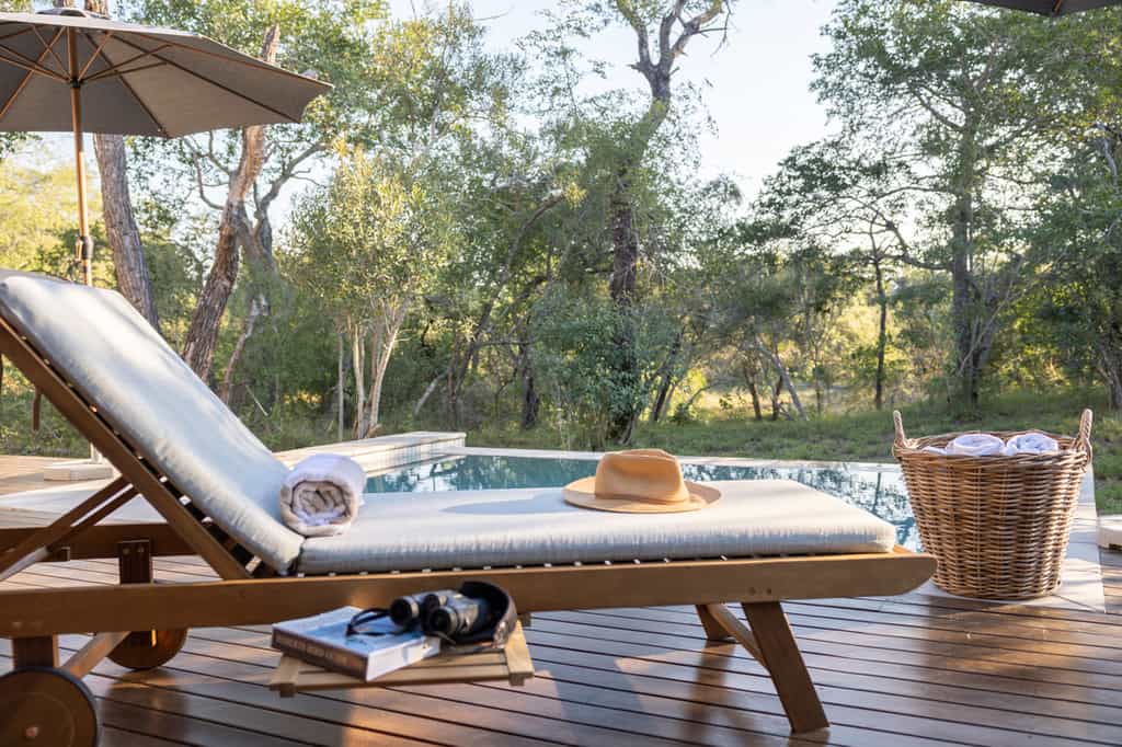 Enjoy siesta time in the elegant lounge, decorated with monochrome wildlife prints, thick rugs and old-school explorer's regalia. Inside the main thatched area, there are full English breakfasts, long-as-you-like lunches, high teas, and generous dinners at Medium Rare, which offers tasty options for carnivores. Or choose to 'rough it' with dinner round the campfire - you'll still have linen napkins origami-ed to perfection! Outside, the terrace has rows of loungers and hanging nest chairs beside the freeform pool.