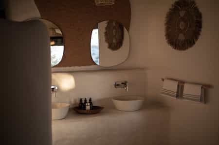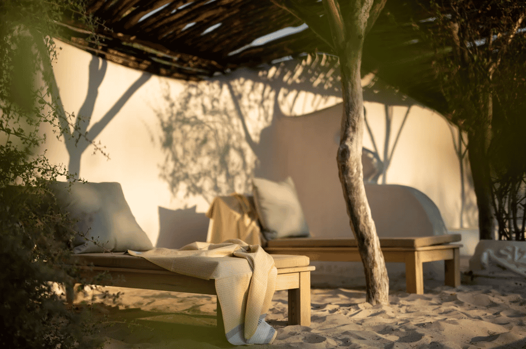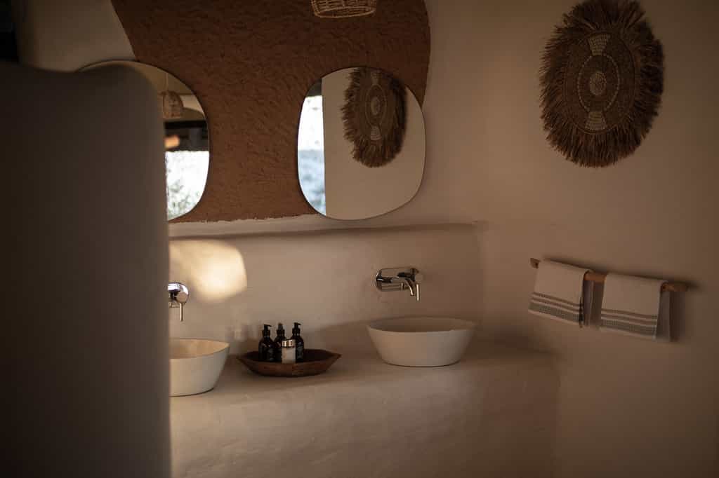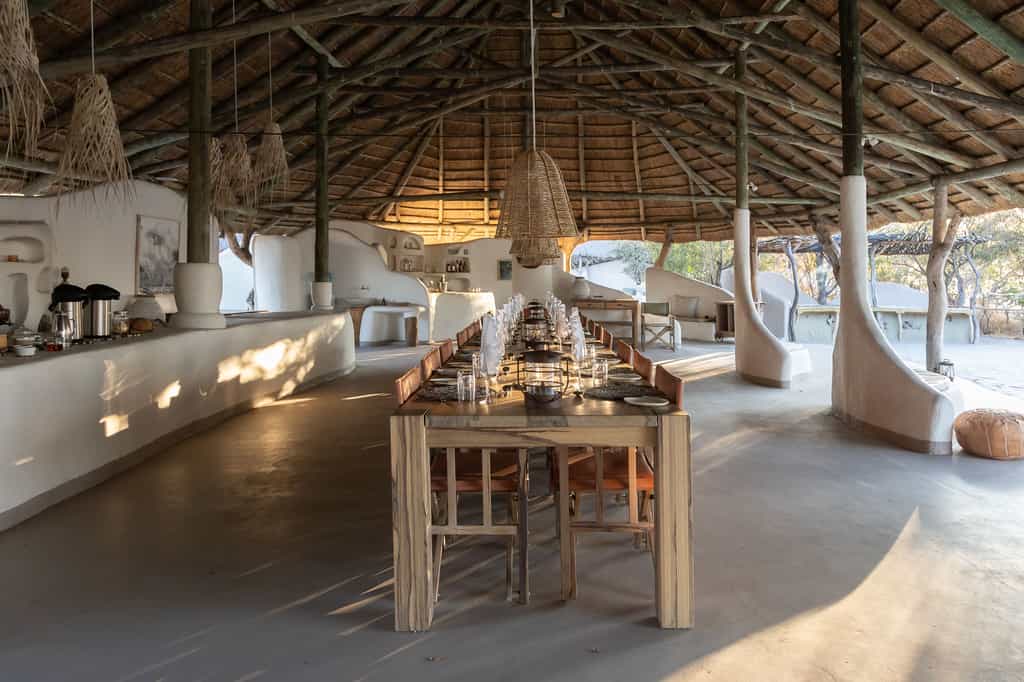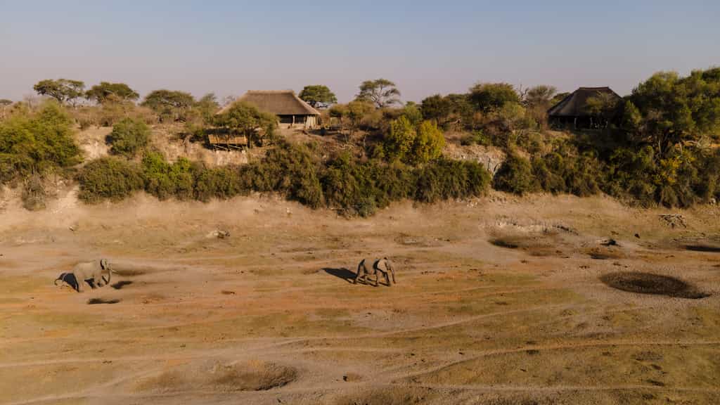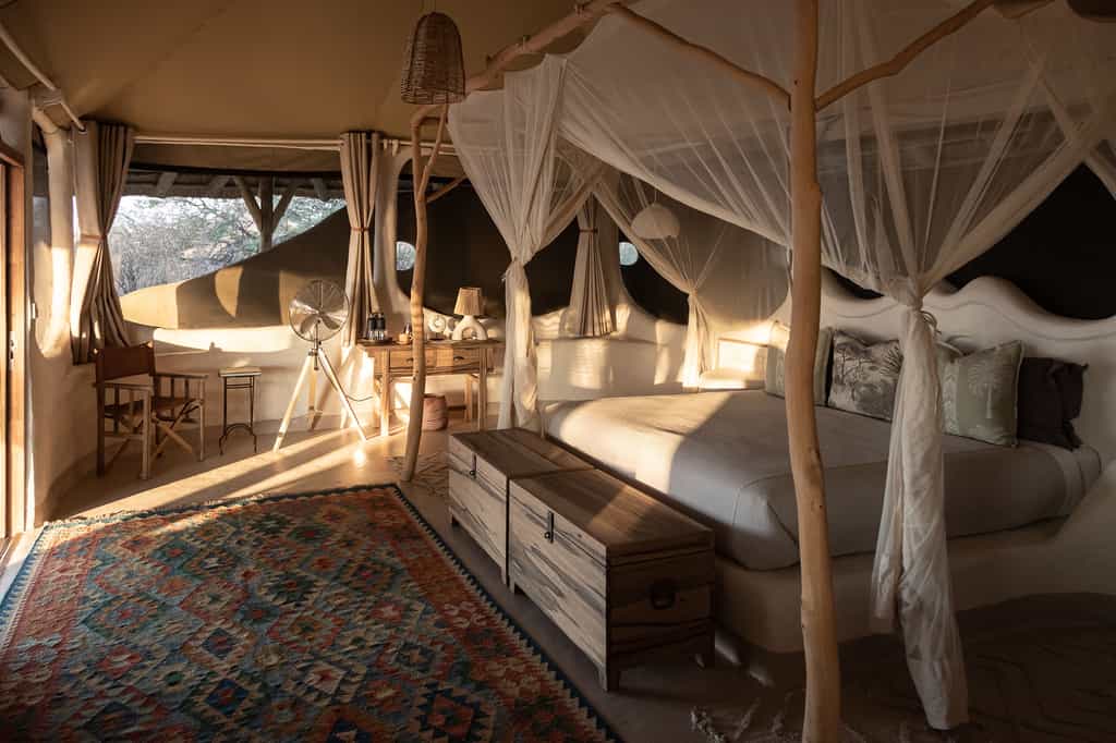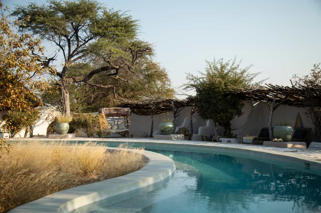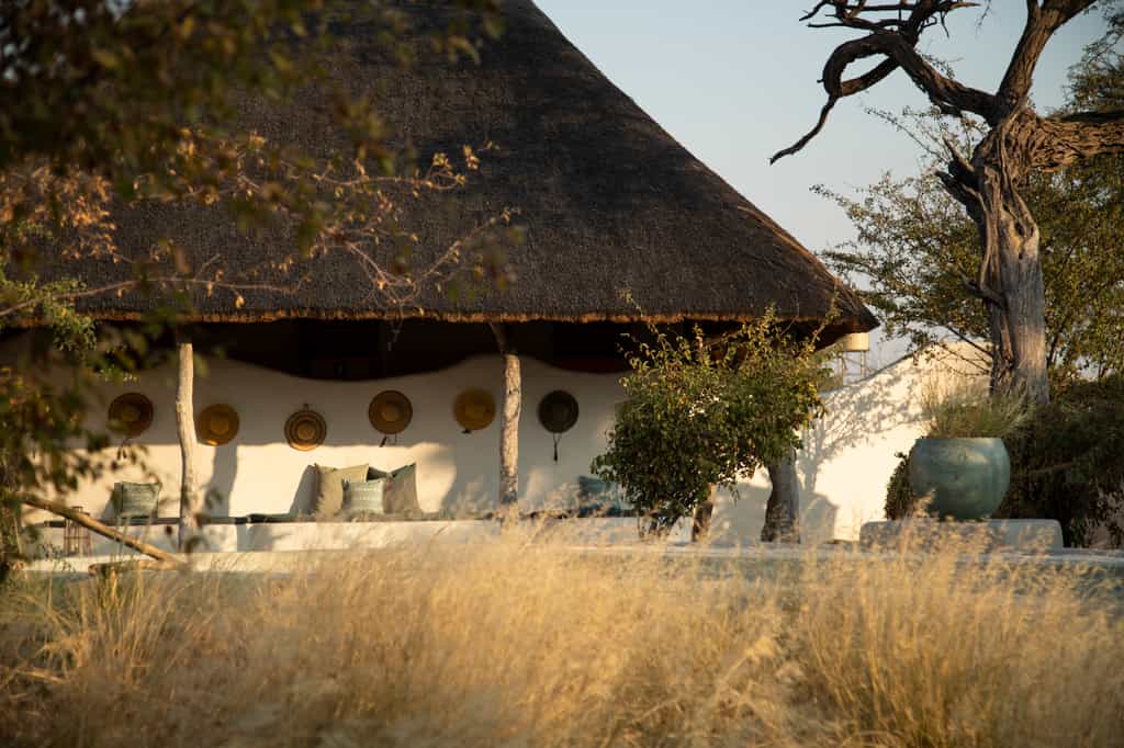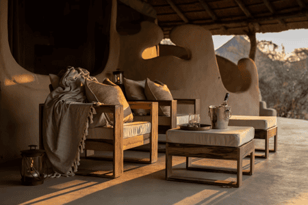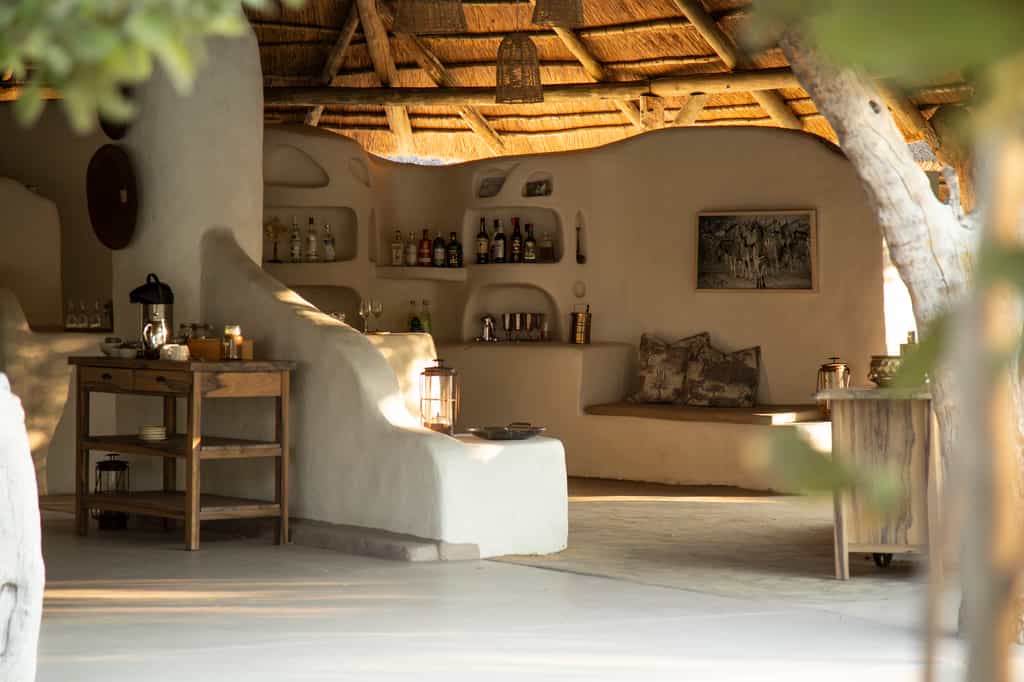 There are eight luxury suites on the hillside, each offering vast views over the wildlife-filled valley and waterholes beyond. Bone-white, clay walls, tented elements, and a thatched roof keep things beautifully airy and cool, even on the hottest of days. Inside, all rooms have four-poster beds draped in soft netting, colourful rugs, an open-plan bathroom and a wardrobe formed by a recess in the clay. They all have an indoor sitting area as well as an expansive deck with 180-degree vistas.