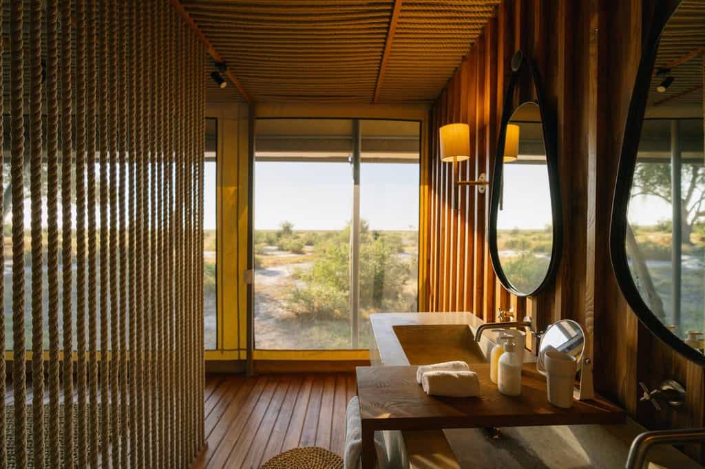 There are nine tented chalets on raised wooden platforms, each with roll-down canvas walls and a private deck that overlooks the plains. All are equipped with a desk, tea/coffee facilities and universal plug points. Bathrooms have flushing toilets, twin basins, walk-in showers and plenty of closet space. On the warmest evenings, turn your tent into a sleep-out thanks to the nifty detachable roof. There are also two chalets with a second bedroom for children and the entire camp is solar-powered.