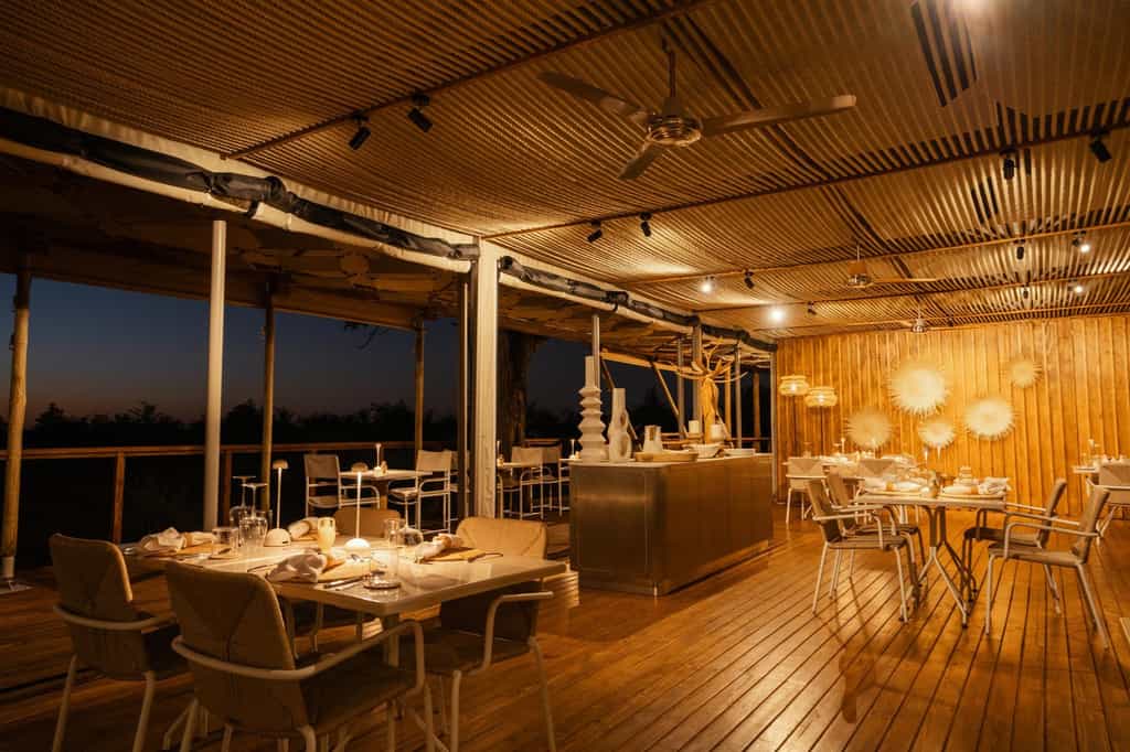 The main camp is a simple wooden structure, which is almost completely wall-less. Spend your down time in the eclectic lounge, which is stocked with tea, coffee and freshly-baked biscuits, best enjoyed with a book from the library. To its left is the small saltwater pool, fed by the camp's borehole, and out front, you'll find the firepit where you'll watch the stars and listen to hyenas calling in the night. The central bar has an array of aperitifs, perfect before a hearty dinner.