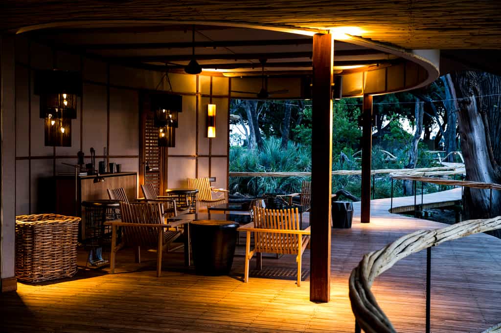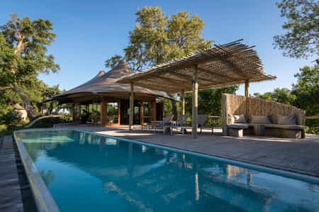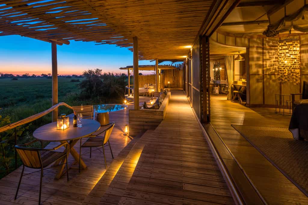 The thatched main area boasts all the usual facilities, as well as two plunge pools and a nice added extra in the form of a gym. Stretched out along the water’s edge, it provides views from every corner of its relaxing setup. It possesses an opulent and vibrant African style with wooden floors, chandeliers and locally-inspired sculptures. Dark heavy woods contrast well with large, comfy sofas in neutral fabrics. The raised wooden deck overlooking the floodplains makes for a memorable dining area.
