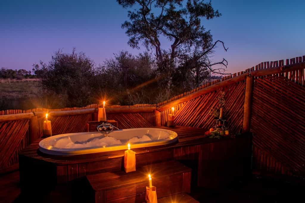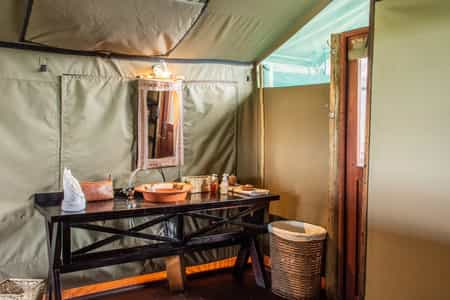 Sixteen en-suite tents stand on stilts above the seasonal river, each private with its own panoramic view. Sandy walkways connect tents to the main area. The verandah and the outdoor showers are top features of these simple but comfortable solar-powered tents. The honeymoon suite has an outside bathtub, raised up on a deck for views of the surrounding reed beds. A family suite has two bedrooms, but just one shared bathroom.