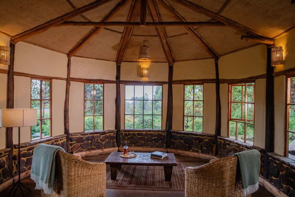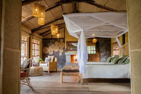Gahinga is inspired by traditional design and building techniques, and the whole lodge is charming and very pretty. The main area sits atop terraced gardens and looks out towards the surrounding volcanoes and the Kisoro valley. Large windows flood the lovely lounge with sunshine, making it a fabulous place to sit and just take in the views - and when the temperature drops, you can move to the second lounge with its enormous, open-sided fireplace. Food is fresh, locally-sourced and always delicious - and much commented upon by previous guests.