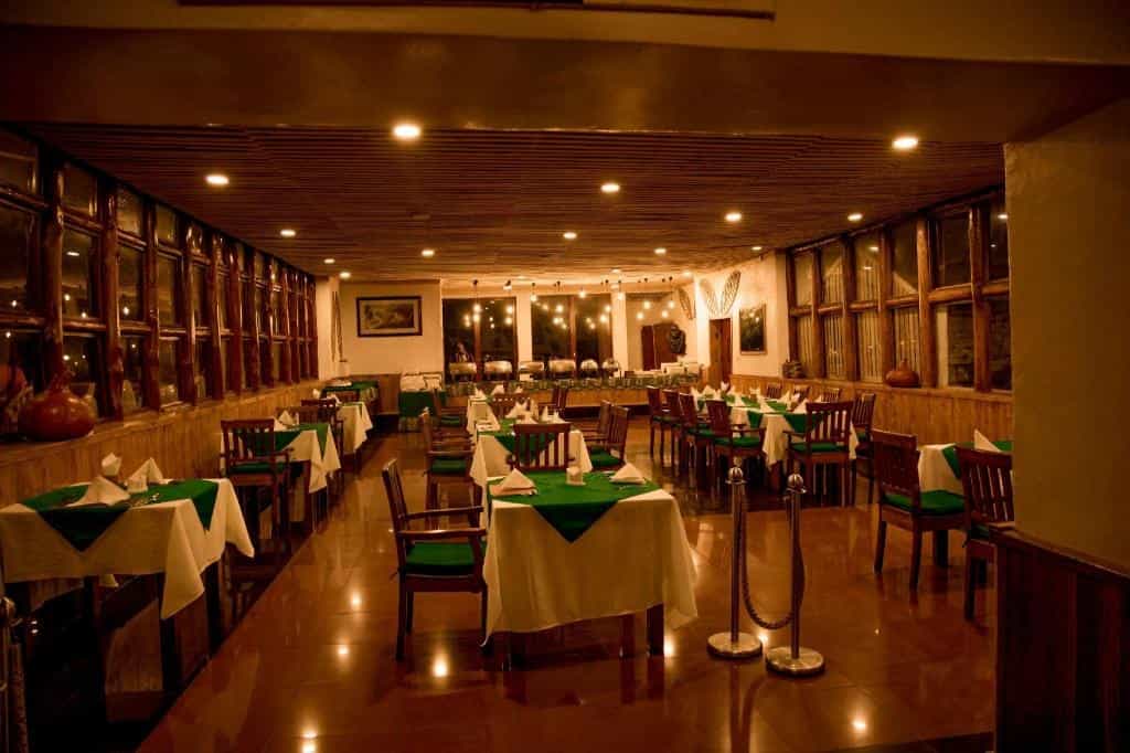 Mountain Gorilla View is an ecolodge sprawled across a large property. In the main building, the atmosphere is warm, with soft couches surrounding a crackling fire and lighting provided by quaint calabash fittings. There's a bar, and buffet-style meals are served in the dining room. The food is fresh, sourced from the garden or local farmers and there's something for everyone (the wine selection is limited). On the lawn, local dancers perform daily. Wifi is available in the lounge area.