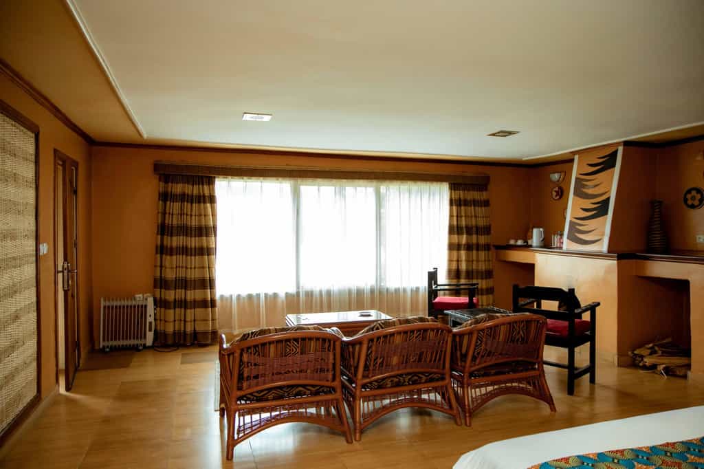 Mountain Gorilla View Lodge has 30 spacious, stone-walled chalets with warm, slightly dated interiors and African decor. Each has a fireplace (nights are chilly), which is lit in the evenings, a large sitting area, a comfortable bed (with hot-water bottles) and roomy en-suite bathroom with open shower, which can make the floor slippery when wet.