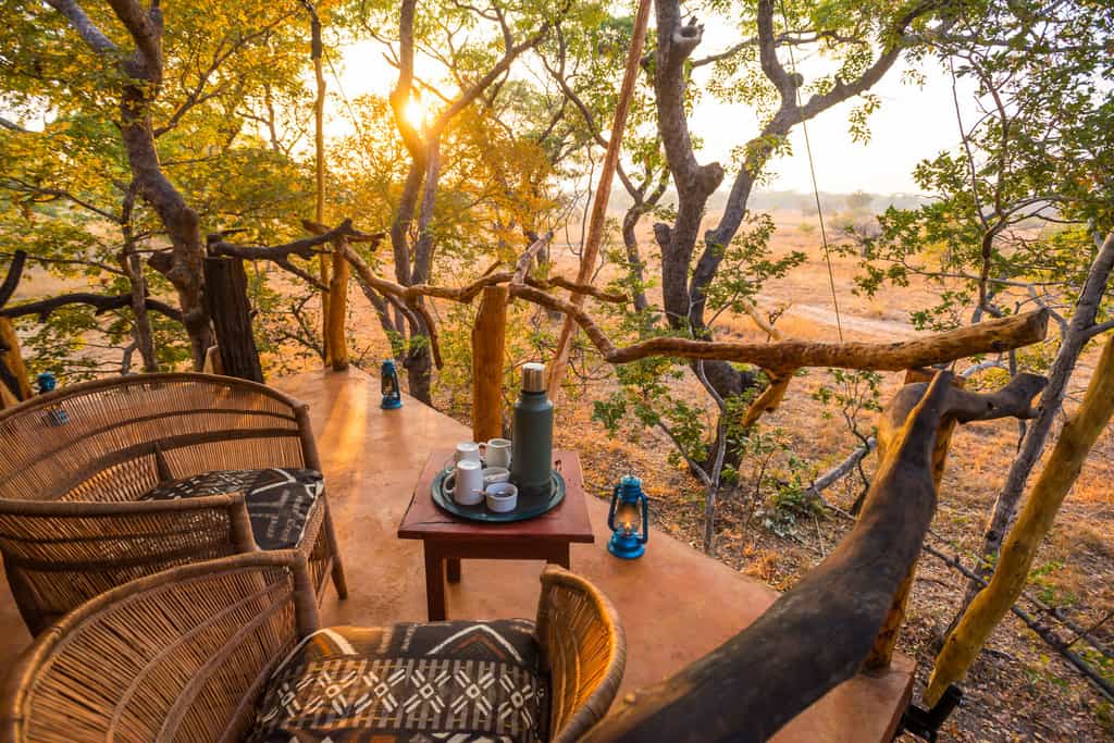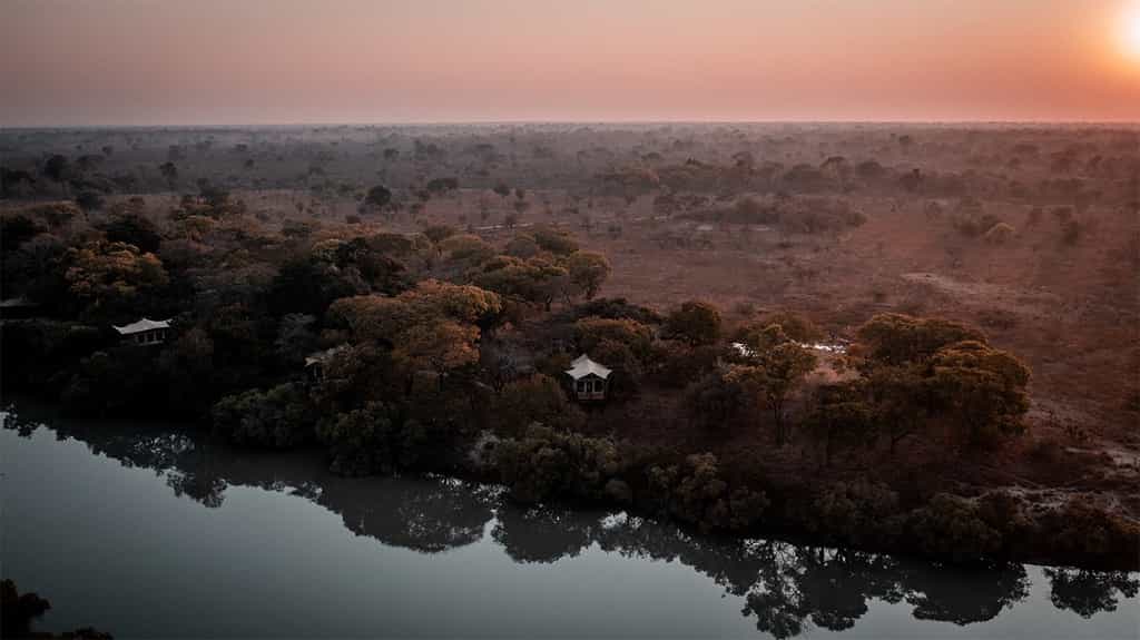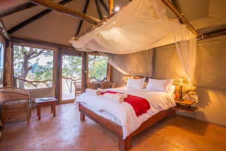 Four light-flooded tents are raised high in the tree canopy, making for some sensational views of woodland, lagoon and plains. A wooden staircase rises to a stone veranda at the front of the room, where there are a few wicker chairs and a small table. Inside, twin or double beds are surrounded by gauze windows on three sides, while the en-suite bathroom at the back, which has a shower, basin and flushing toilet, is enclosed by a reed screen.