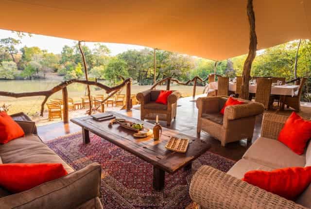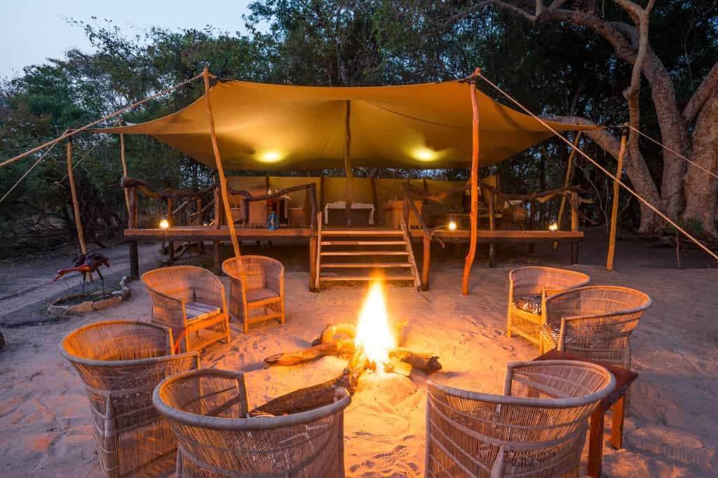 Sandy paths lead from the tents to the open-plan lounge and dining room. Elevated on a wooden deck, the canvas-roofed main area has beautiful views of the beach and lagoon. To one side is a communal dining table; to the other a few comfortable wicker chairs and couches. Nearby, the famed fig tree hangs over a boma, where alfresco dinners are served around a crackling fire. From the camp, a path leads to the lagoon and its shady hammock.