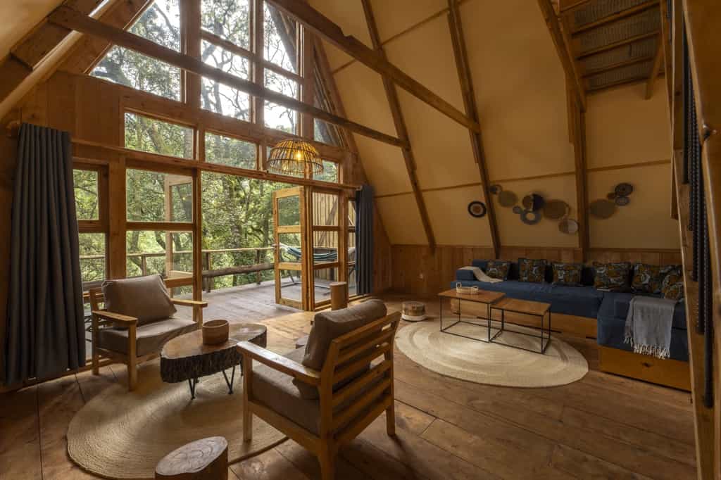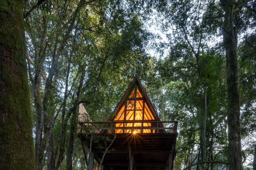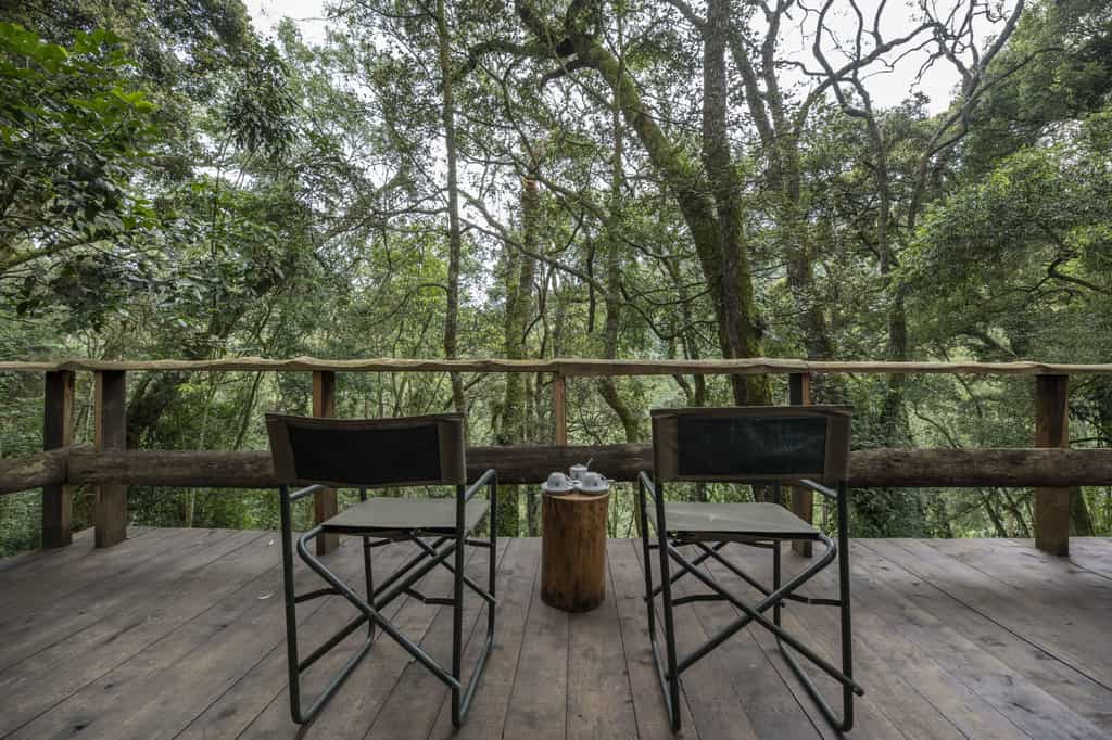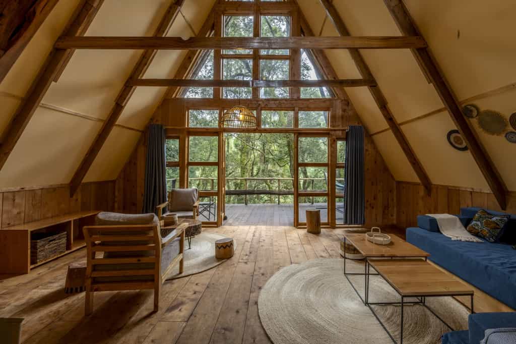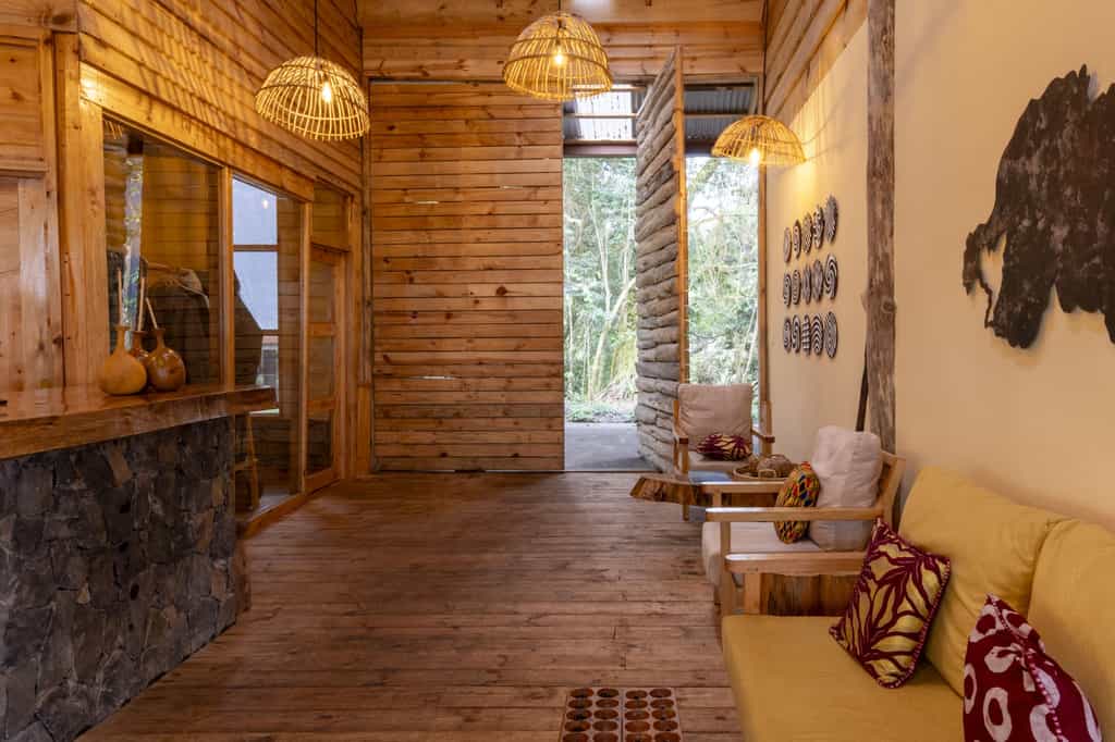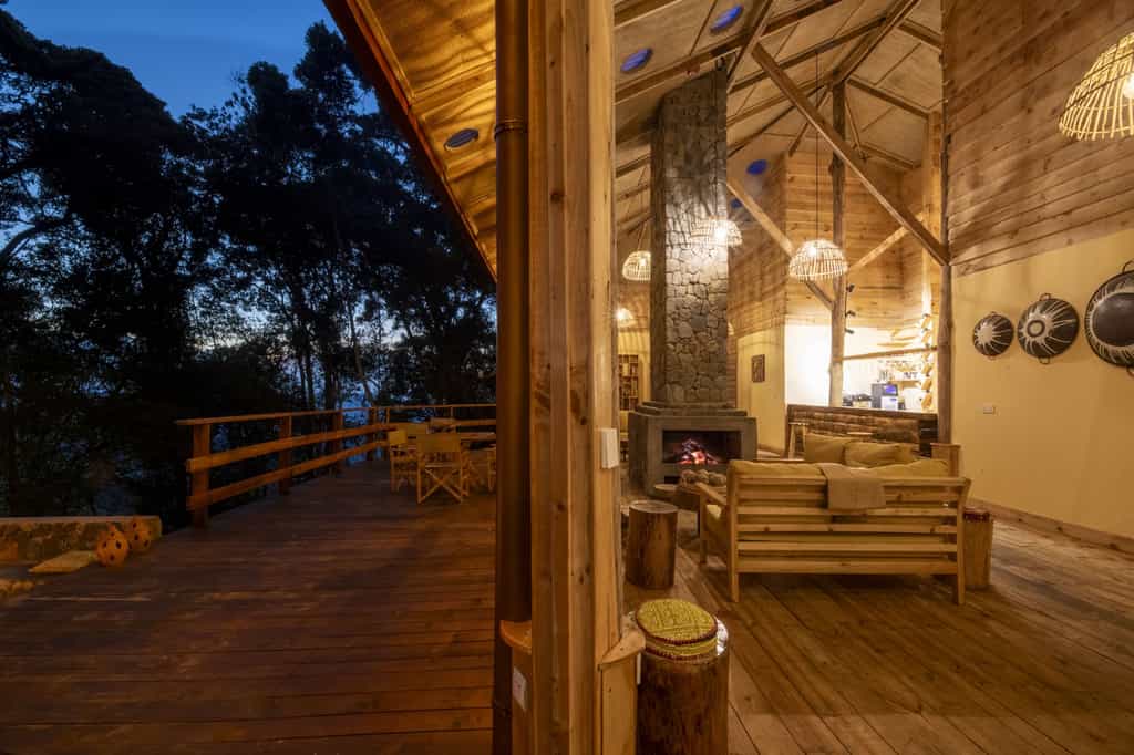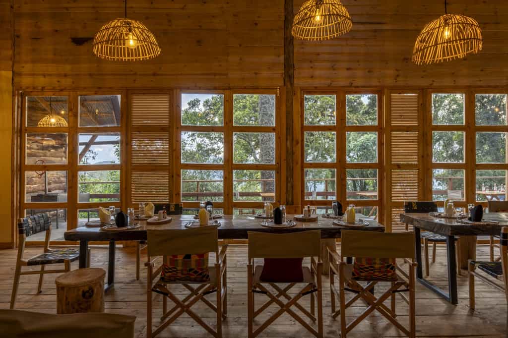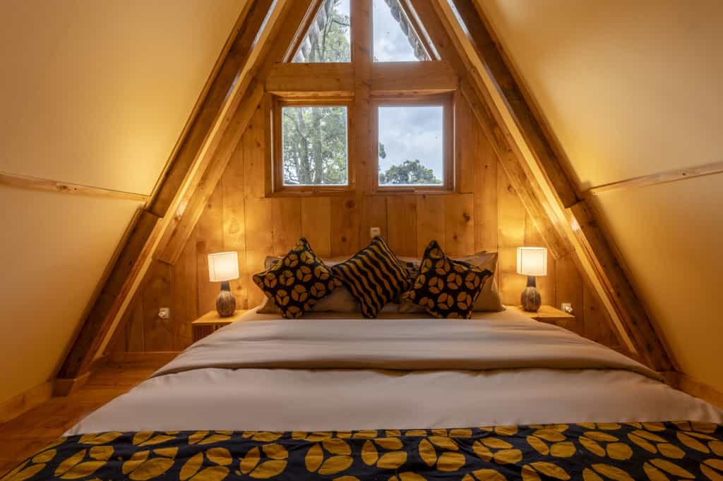 Tucked away in the lush forests of Nyungwe, Munazi Lodge is built using reclaimed exotic wood from the National Park, helping native plants regenerate and supporting the local environment. The signature A-frame cabins are designed to suit the region’s high rainfall while letting in natural light and keeping you warm. Elevated above the forest floor, each private unit blends into the landscape and offers wide, open views making you feel connected to nature while still having your own space. Forested footpaths lead to every cabin, adding a sense of adventure and tranquillity to your stay. Most of what you’ll see and experience here, from the handcrafted furniture to the thoughtful design of our spaces, is made by local artisans and construction teams, working closely with park managers and engineers. It’s a community effort, rooted in sustainability and respect for the land.