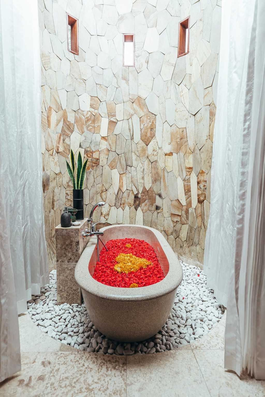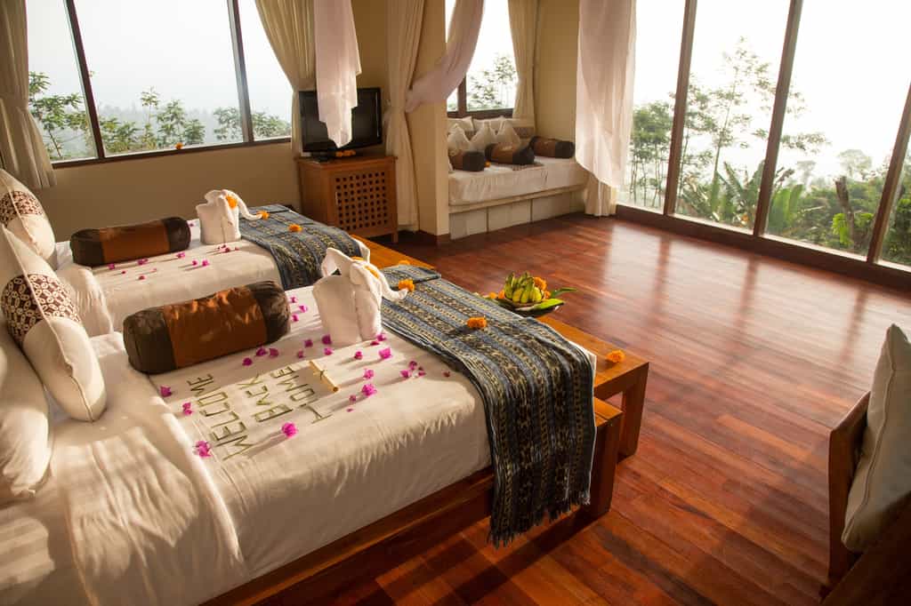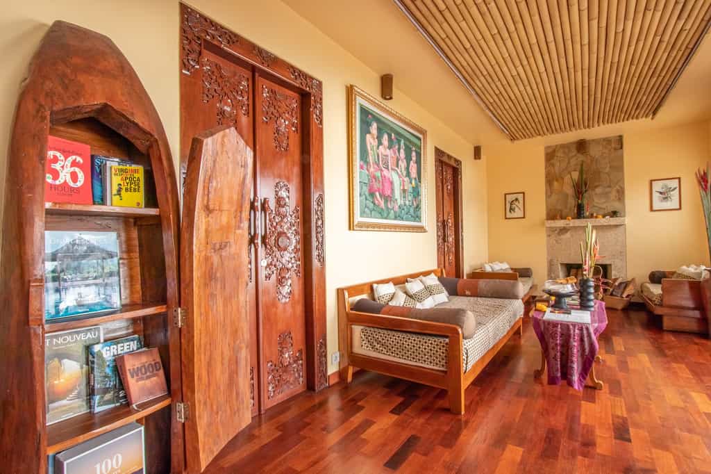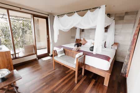 Scattered amongst four verdant acres, the suites and villas are all supremely private. Simple but comfortably furnished, all have four-poster beds, a breezy sitting area and lots of gleaming, polished wood. They are spacious and many open onto a private pool and hot tub with views of the jungle-clad ravine, flower-filled meadows or rice paddies. The bathrooms are spa-like and marble-clad, all with large, stand-alone tubs and rainfall showers. Wall-to-wall glass lets in plenty of natural light and invites the glorious outdoors in.
