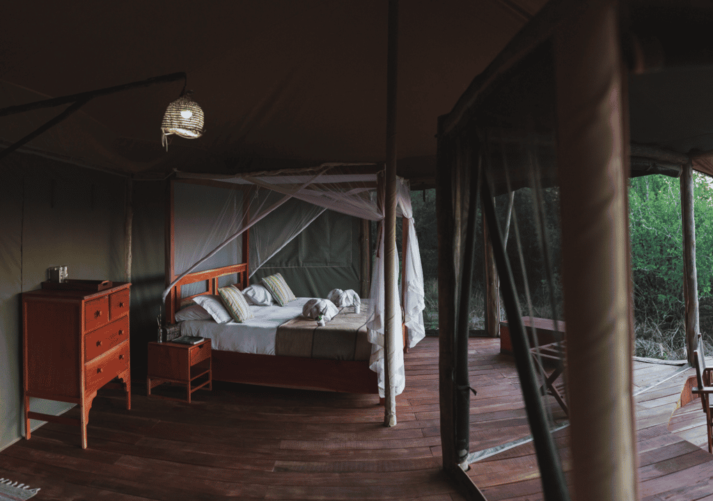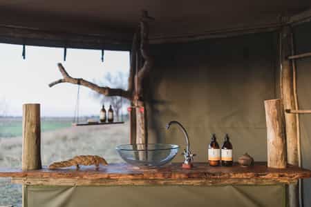 There are wonderful views from all five of the safari tents which are home to comfortable beds made up with soft, quality linen and furniture made of locally sourced wood including the Sycamore Fig Tree, also referred to as the tree of life. The bathrooms are ensuite and open-air, with on-demand hot water showers and flushing toilets.