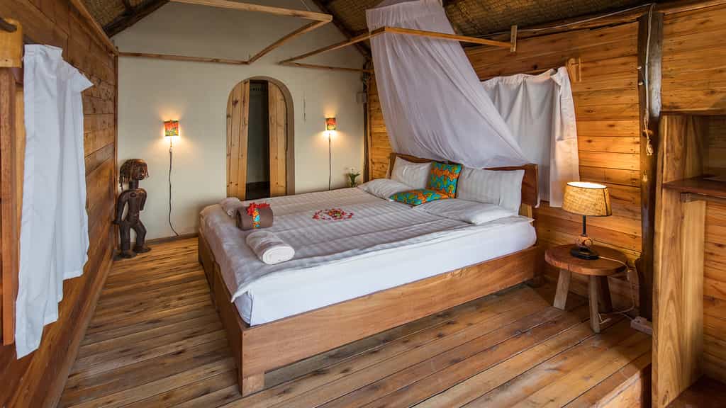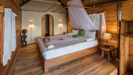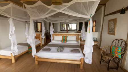 The lovely A-frame cottages feel like slender Swiss-meets-African chalets. They're set on the hillside with a steep staircase leading to the private veranda. Inside they are cosy but comfy, configured with two singles or a double bed, always draped with mosquito netting. Glass doors ensure plenty of natural light, and the en-suite bathrooms have piping-hot showers to wash off the jungle. Family rooms are a bit more spacious and hardily built, able to sleep three in a master bedroom and small adjoining room.