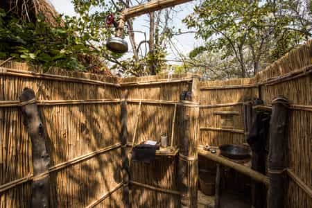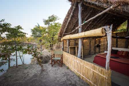 With only 4 chalets, the camp’s exclusivity remains at the centre of its attention. The reed huts are built around the twisted branches of mopane trees and although simple, cover all essentials with even a self-charging torch included. The en-suite bathrooms are all open-air with soft, sandy floors and are the ultimate in barefoot simplicity. Hot water for the sink is provided through a hatch in the morning and for the shower, on request at any time.