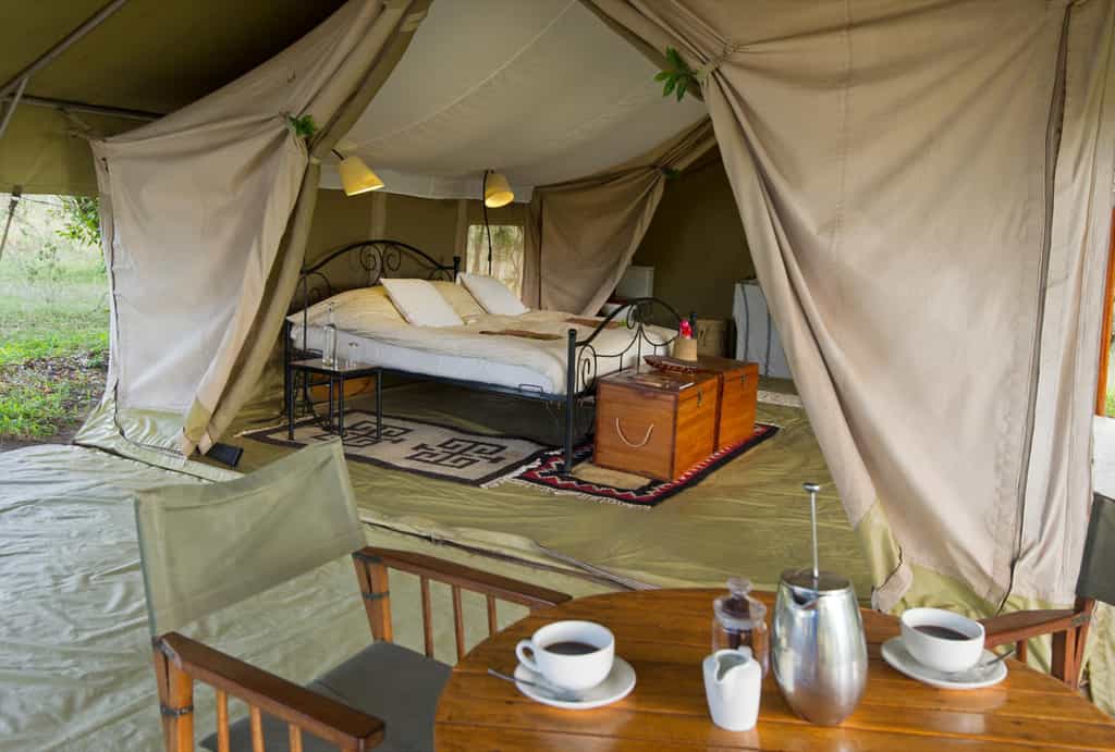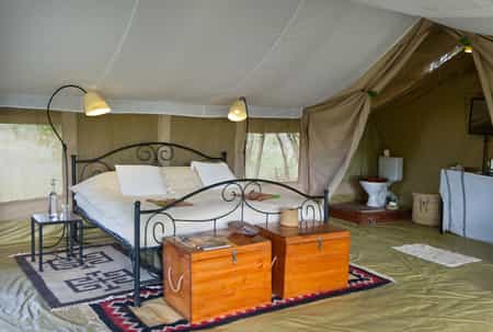 As the least pricy of the Naibor camps (Naibor and Little Naibor camps are also in the Masai Mara), Naibor Wilderness has the classic safari tent vibe without too much fuss. Comfort and space have not been compromised, though. The three tents may be simply furnished, but the wrought-iron bed is stylish, the linens are top quality, the numerous woven carpets are woollen, and the tents are flooded with light. An en-suite bathroom has a flush toilet and bucket shower.