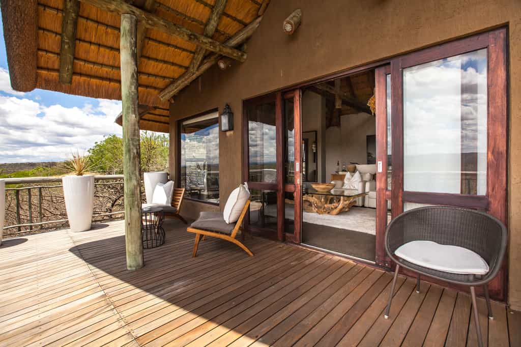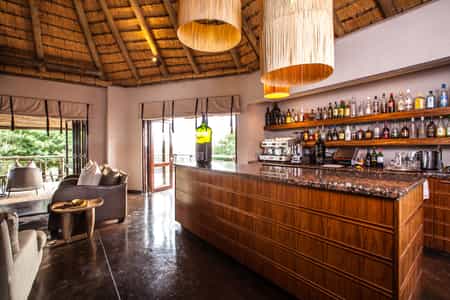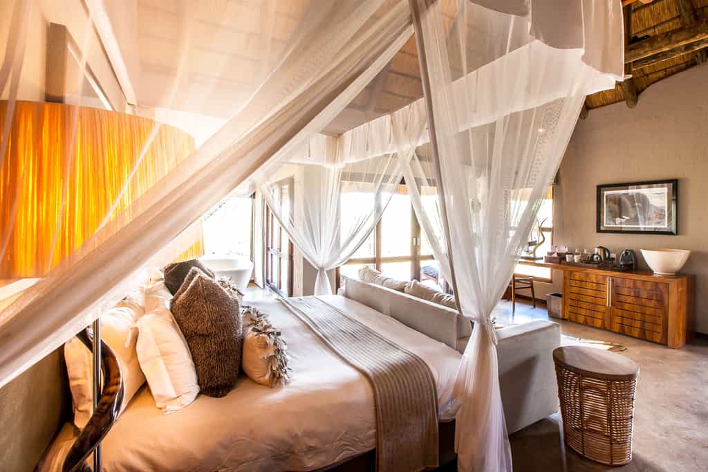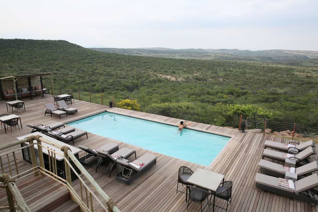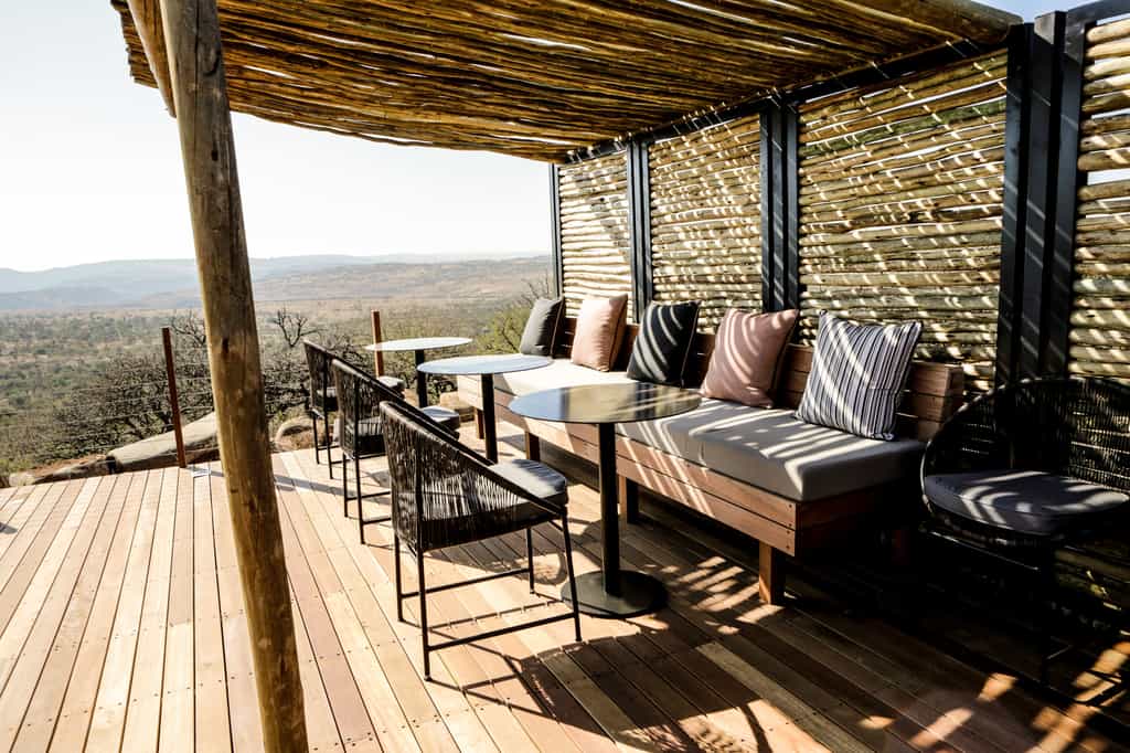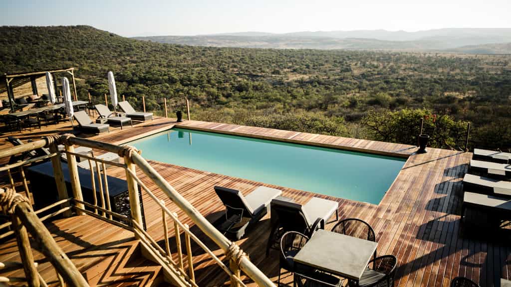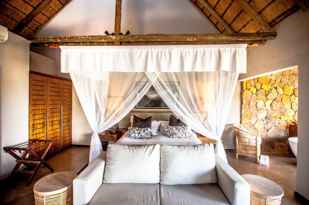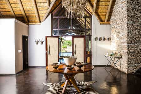 Architectural flair draws on Nambiti’s sense of space and far-reaching views, with vaulted thatch above wide stretches of natural floors and cool interiors. The lofty glass-enclosed dining and lounge areas provide unimpeded views of the surrounding bushveld and clear night skies. A wraparound deck with shaded sun loungers, bar area and sunken fire pit faces across rolling lawns, down to a waterfall which splashes into the swimming pool below. During winter, cosy indoor fireplaces add warmth and a romantic atmosphere.