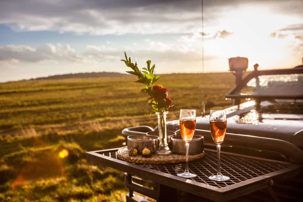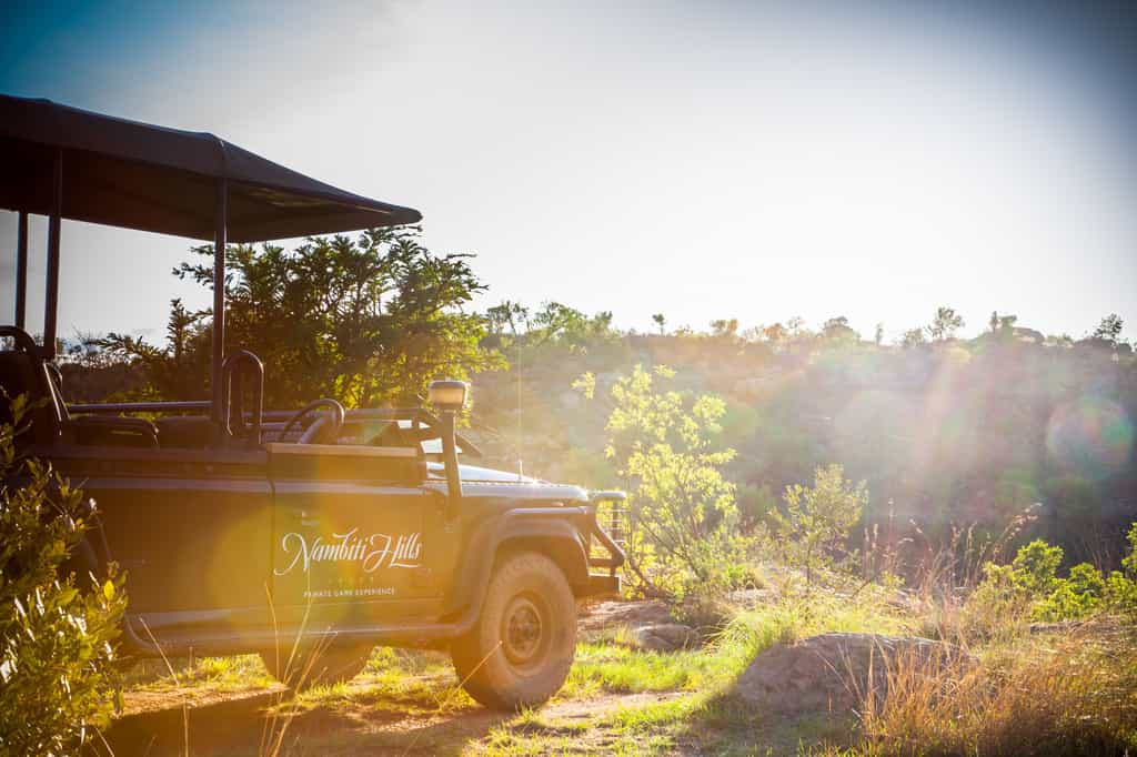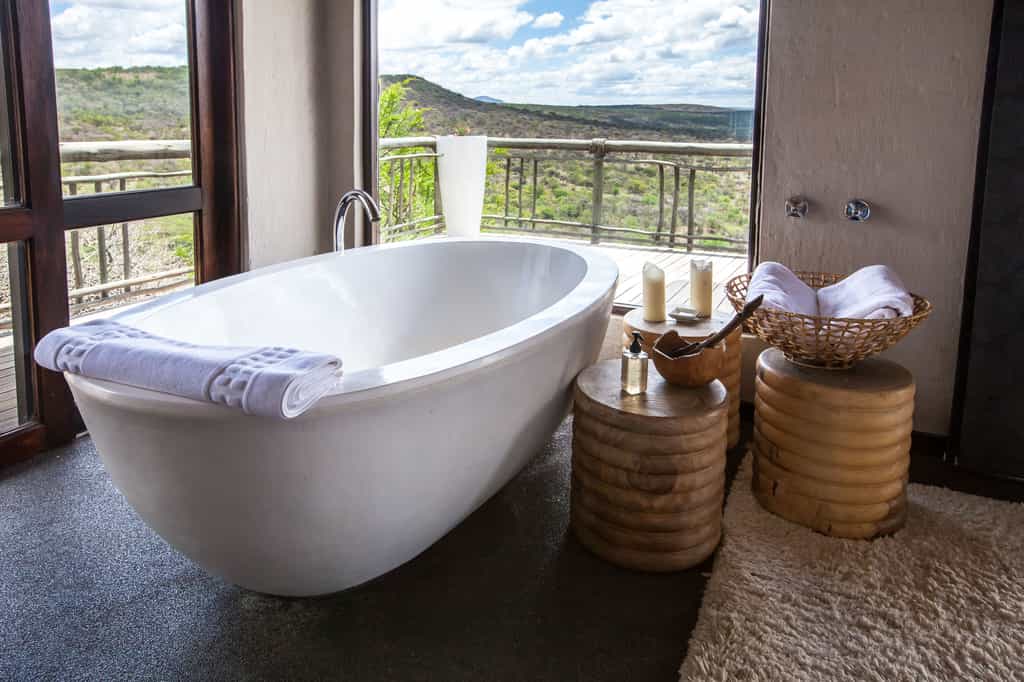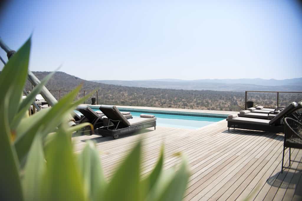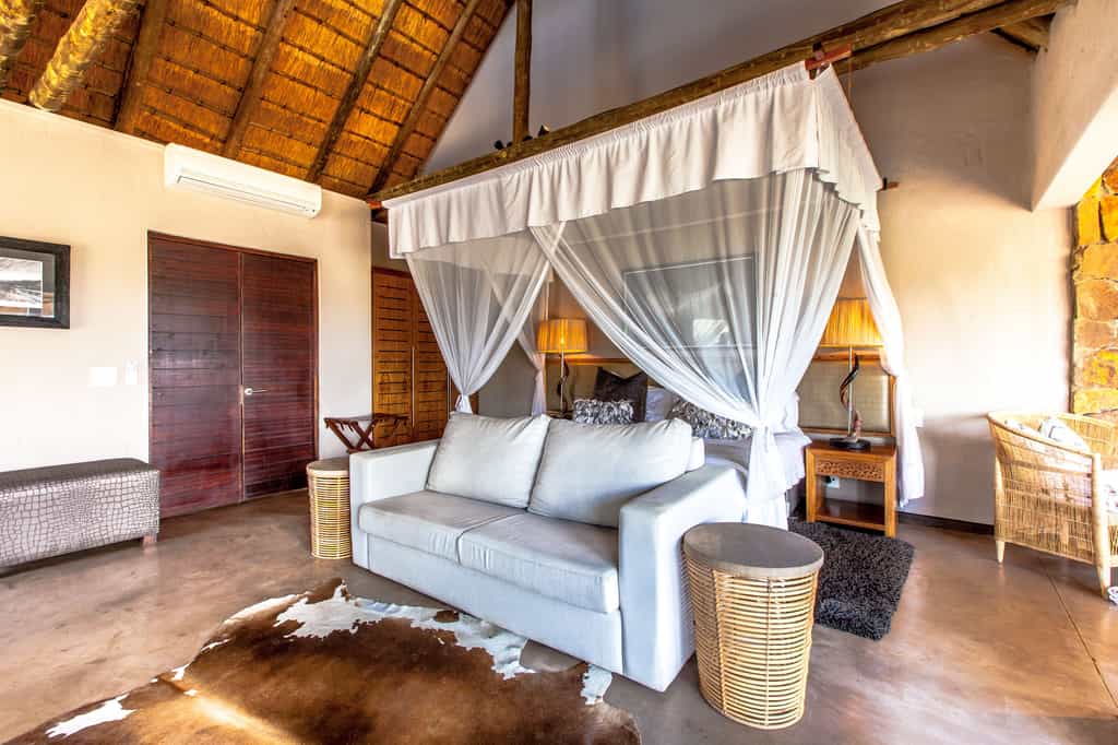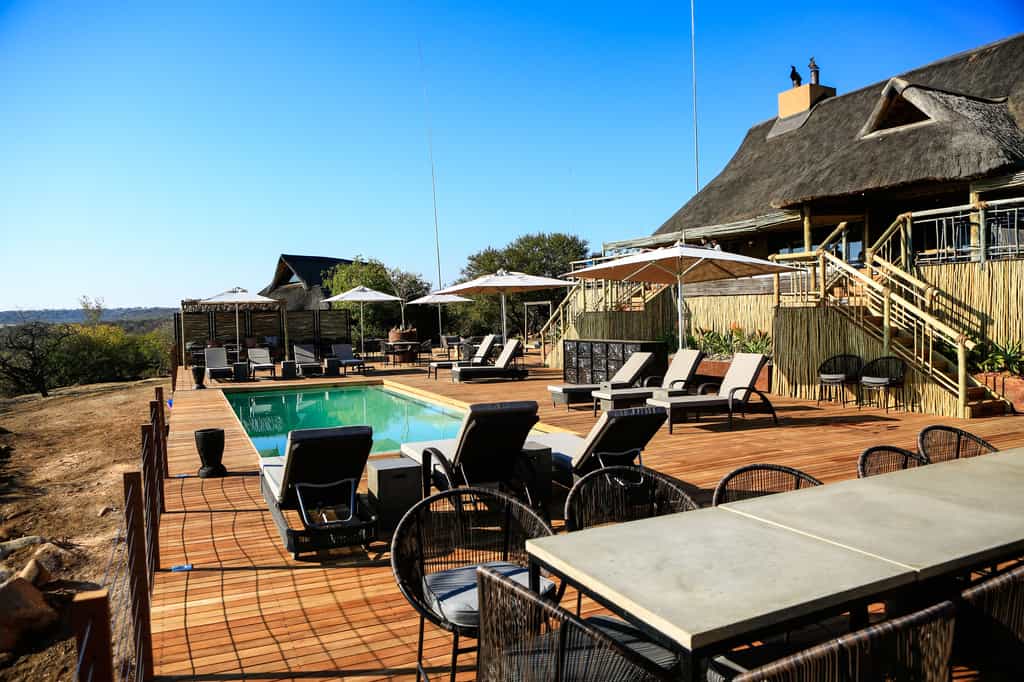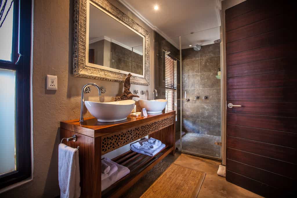 Architectural flair draws on Nambiti’s sense of space and far-reaching views, with vaulted thatch above wide stretches of natural floors and cool interiors. The lofty glass-enclosed dining and lounge areas provide unimpeded views of the surrounding bushveld and clear night skies. A wraparound deck with shaded sun loungers, bar area and sunken fire pit faces across rolling lawns, down to a waterfall which splashes into the swimming pool below. During winter, cosy indoor fireplaces add warmth and a romantic atmosphere.