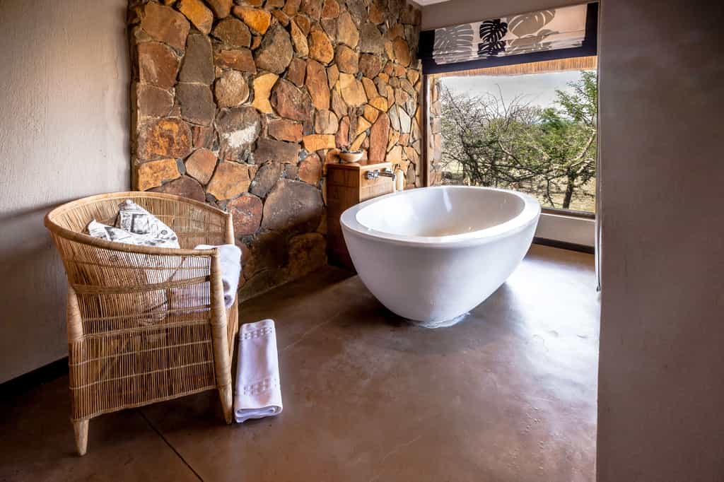 Eight luxury suites and a secluded honeymoon suite suspended from the ridge of rocky hills overlook the valley, with private decks and roomy open-plan interiors. King-sized four poster beds with mosquito nets, pure cotton linens and African artefacts create an elegant feel, with huge windows for plenty of light and stunning views. Bathrooms are en-suite with indoor showers and oversized stone baths, with an additional outdoor shower in the honeymoon suite for that extra special touch.