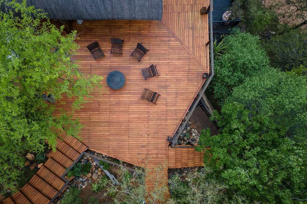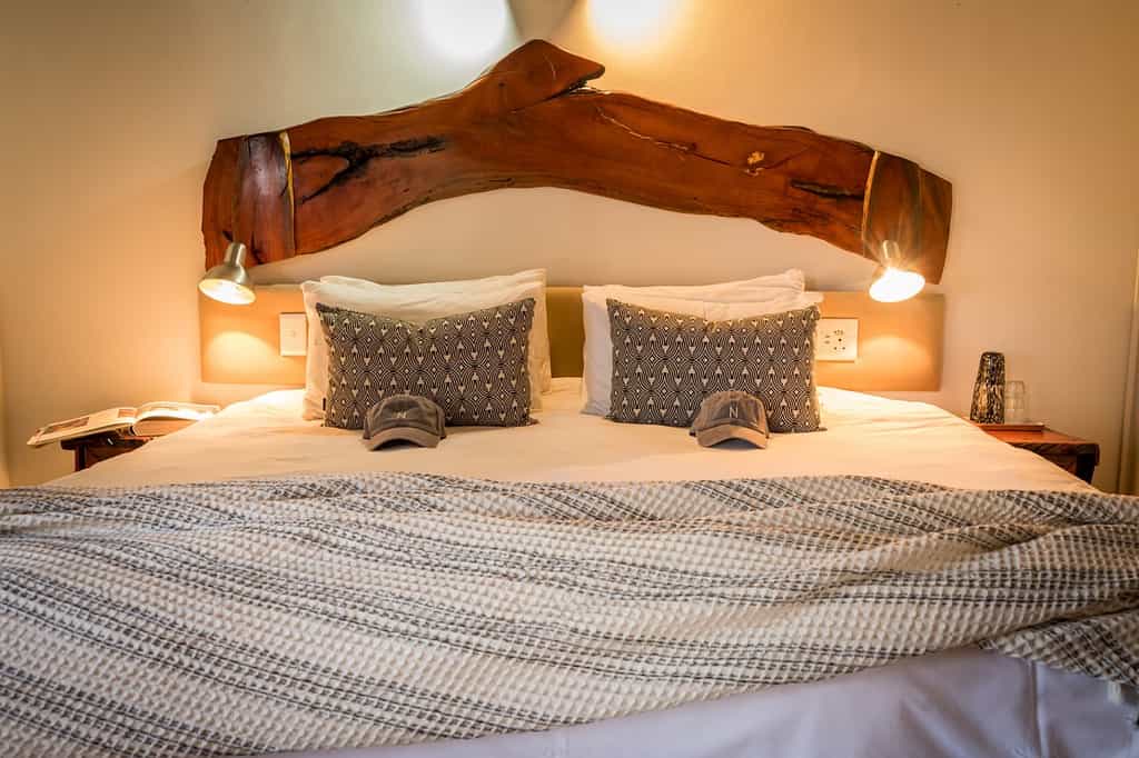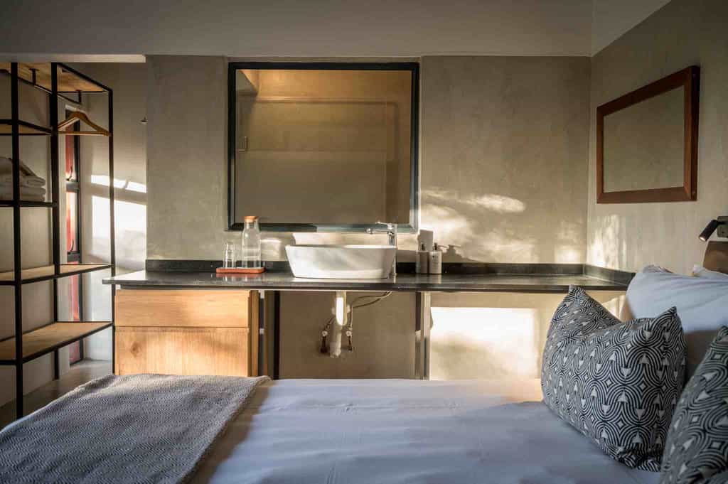 Winding wooden pathways lead through the gardens to the six chalets, each simply decorated in neutral, earthy tones and rustic finishes. They are all furnished with plump king-sized or twin beds (with a hotel-standard charging station) and the modern bathrooms have full amenities and a rainfall shower. Each chalet has a private deck; four enjoy views of the wilderness beyond while Number 3 and 5 look onto the garden. Each is air-conditioned and they have ample storage space for personal belongings and luggage.