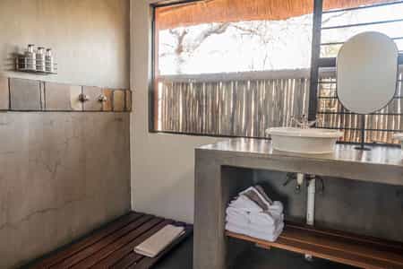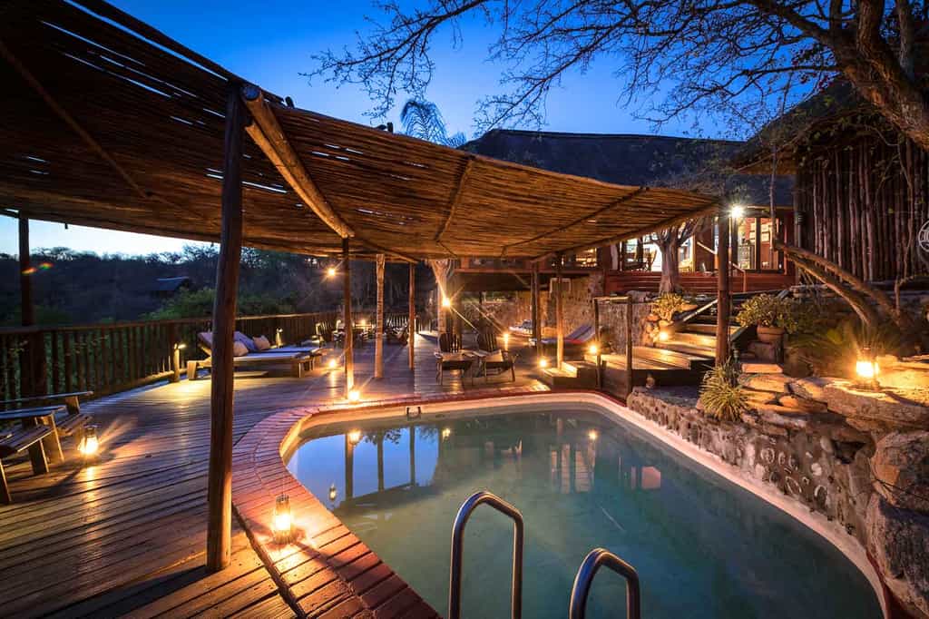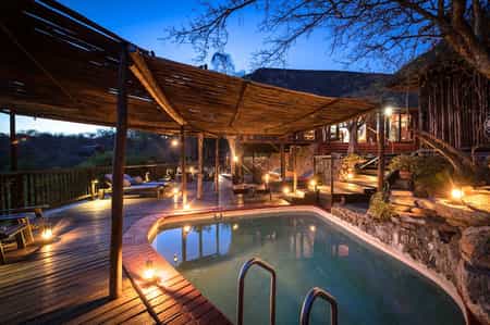 With its thatched roofs and orange-red exteriors, Nambu Camp has a rather distinctive look, and inside, you'll find a classic safari lodge style. The pool (heated when needed) will quickly become a favourite hangout with its amazing views over the waterhole below. Alternatively, head for the vast viewing platform where you can enjoy an armchair safari and try to spot the resident tawny eagles. The owner is a foodie so the cuisine is top-notch; choose from an ever-changing set menu and enjoy it in the alfresco boma area.