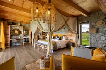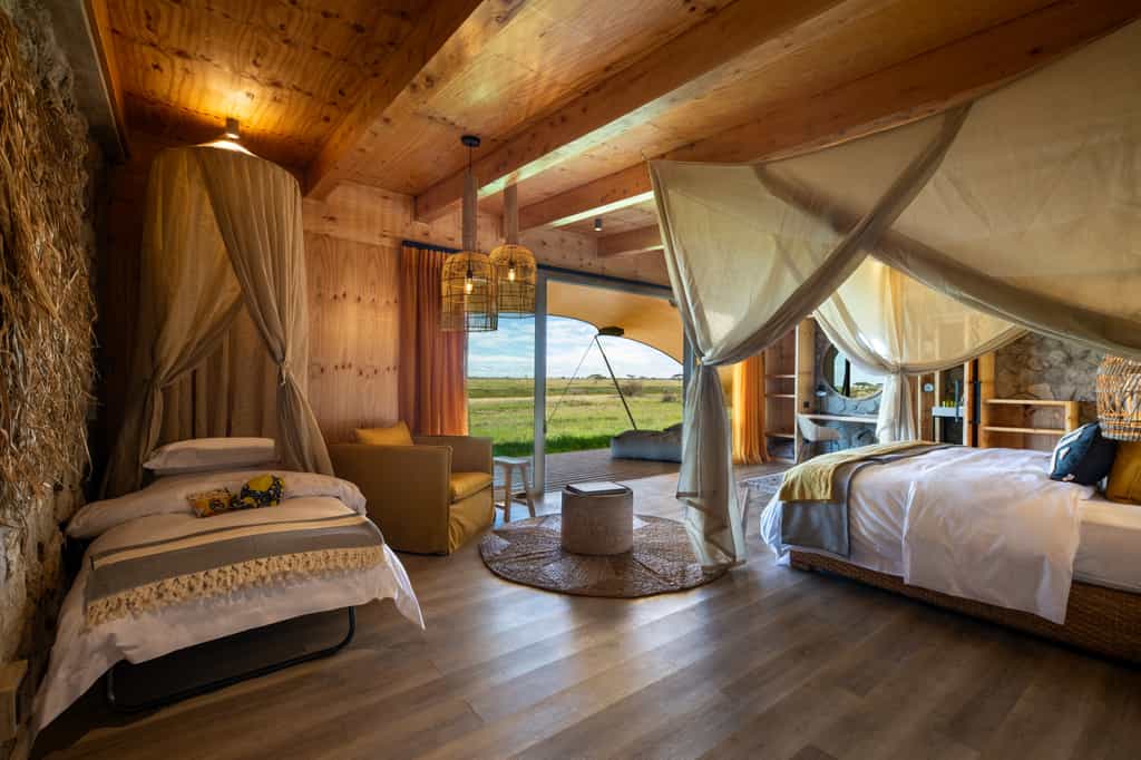 The two retreats can be booked individually or together for groups. Each has two bedrooms, both en-suite, a central lounge and dining area leading onto a deck and firepit area, and comes with its own chef. Each bedroom is very spacious with a large king size bed (twins are also possible) and views out over the Serengeti from the deck. The en-suite bathrooms have flush toilets, a double sink, shower and beautiful outdoor bath with a view, tucked away for privacy. It is possible to add 2 additional beds to accommodate children in each retreat - maximum capacity of each retreat is 6 people. Each retreat also comes with its own safari guide and private safari vehicle, allowing for an entirely flexible safari experience planned around your pace and preferences (within the bounds of national park rules). Shared between the two retreats is a swimming pool with sunloungers, lounge and library area as well as a large dining area to accommodate groups when both retreats are booked together. This is only for the use of guests at the retreats, not the main camp. The main Namiri Plains camp is located to one side of the retreats. It is possible to book one guest tent at the main camp in conjunction with each retreat. Retreat guests are able to book spa treatments at the main camp.