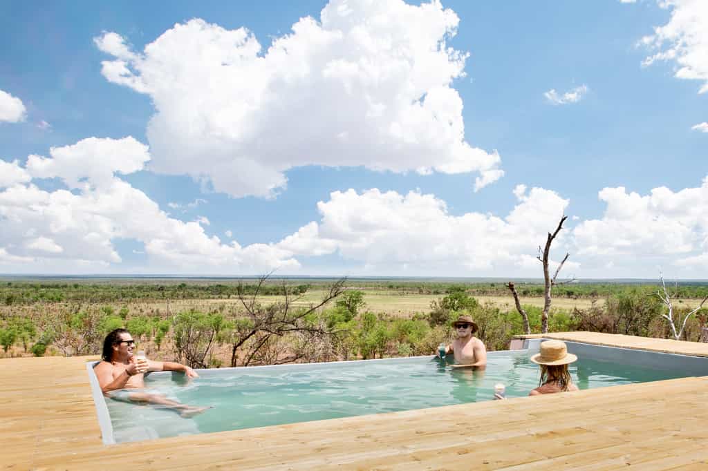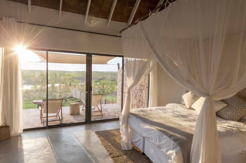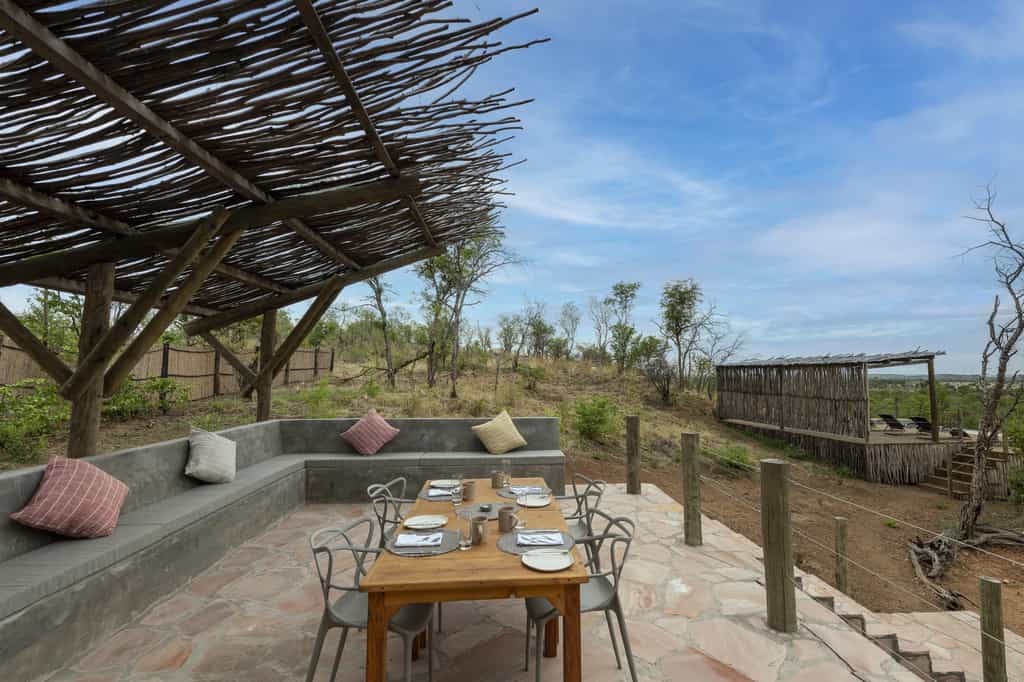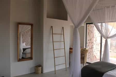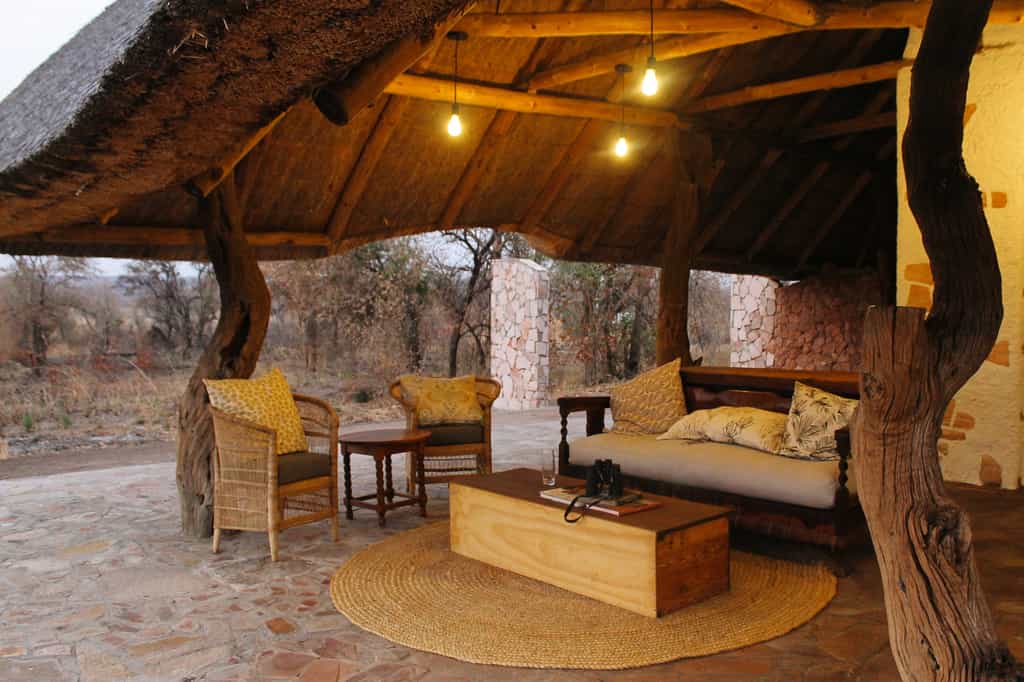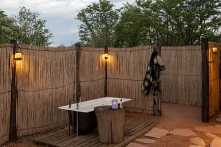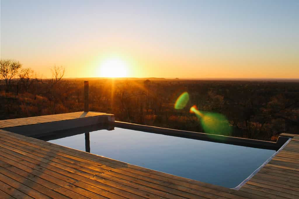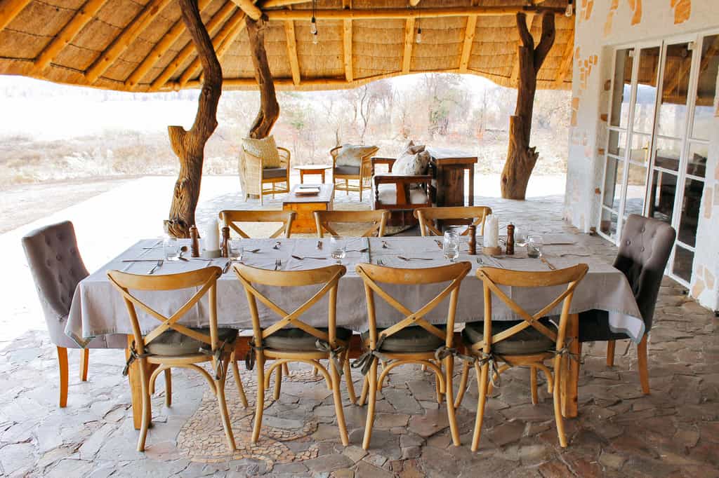 The main area has a beautiful, rustic-luxury appeal, built of natural wood and decorated with colourful textiles. All areas overlook the dam, where hippo hrrumph and crocs laze in the sun. Outside you'll find an eco-pool with loungers, and beside it, a well-equipped bar. Meals made with locally farmed produce are served beneath the stars in the boma, or on the wide deck. (Watch dishes being prepared in the open-display kitchen). There's a cosy open-plan lounge, and a library.