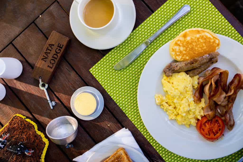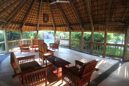 This ample area consists of a collection of traditional thatched-roof structures, cleverly arranged and spaced with open-air seating areas. It is a shady haven for guests seeking both rest and fellowship between activities with its large indoor restaurant area and open-air patio. At the restaurant, enjoy a continental or English breakfast buffet or choose from the a la carte menu for lunch and dinner. Convene in the lounge before morning or afternoon activities, or chill by the pool in one of its many sun loungers, sipping one of Nata's signature cocktails. A small but well-stocked gift shop sells a plethora of hand-made souvenirs.