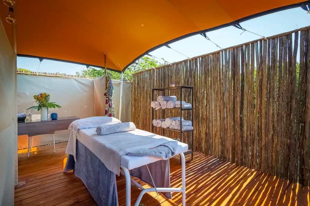Broad, elevated decks, open-sided but sheltered by stretched canvas, give the main area a pleasant sense of the flow between indoors and out. The interiors are impeccable. Expect contemporary style, natural materials, loads of comfort and splashes of vivid colour, and an intriguing sense of both cosiness and space. There's a large canvas dining room and lounge. Outside, cushioned seating beneath broad umbrellas beg you to settle back and relax. Beyond, on a gentle rise, lies the pool.