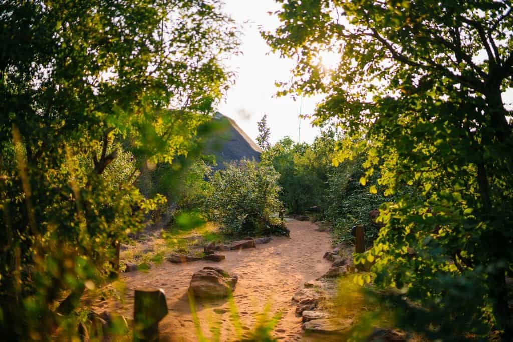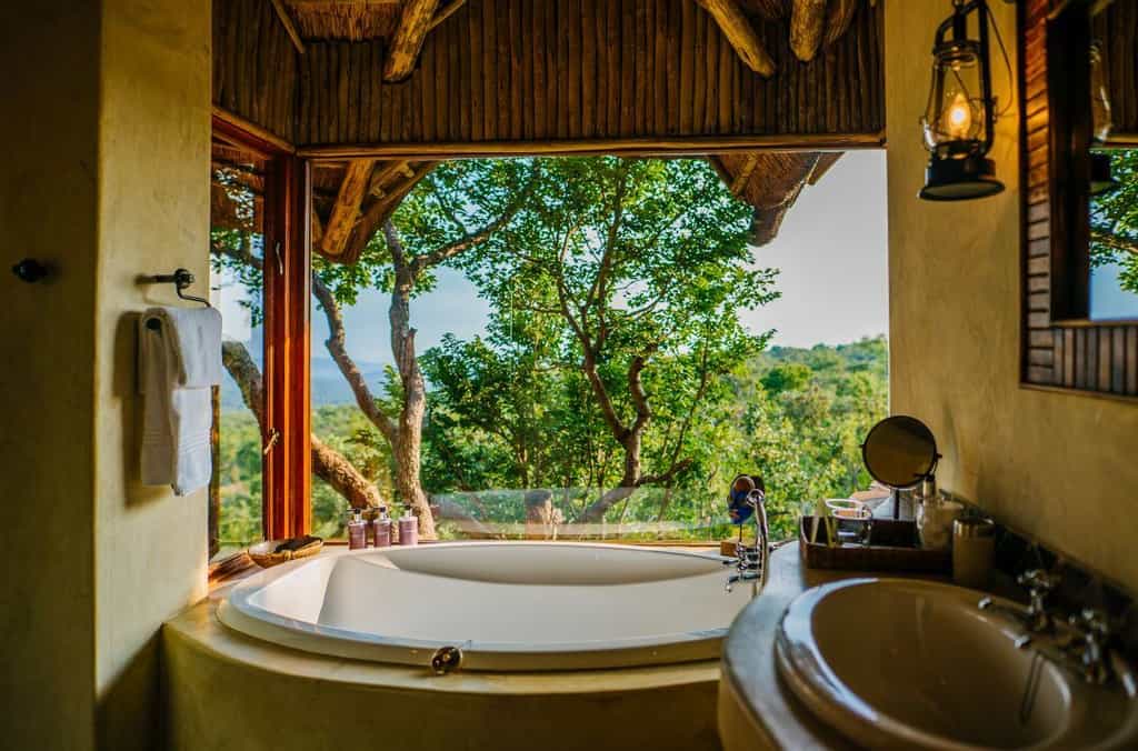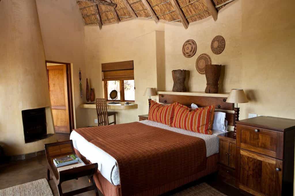 Tucked among the thorn trees and deep-red boulders are five suites, all facing the bushveld to make the most of the sunlight and the views of the intriguing, blue-tinted Waterberg mountains. Your private veranda leads into a cosy space, decorated in tasteful brick reds, ochre and earthy browns, with fabrics and carpets of natural fibres. A small fireplace keeps you warm when temperatures drop, and dreamy sunken baths set alongside large windows frame the trees outside, and those sublime views.