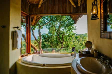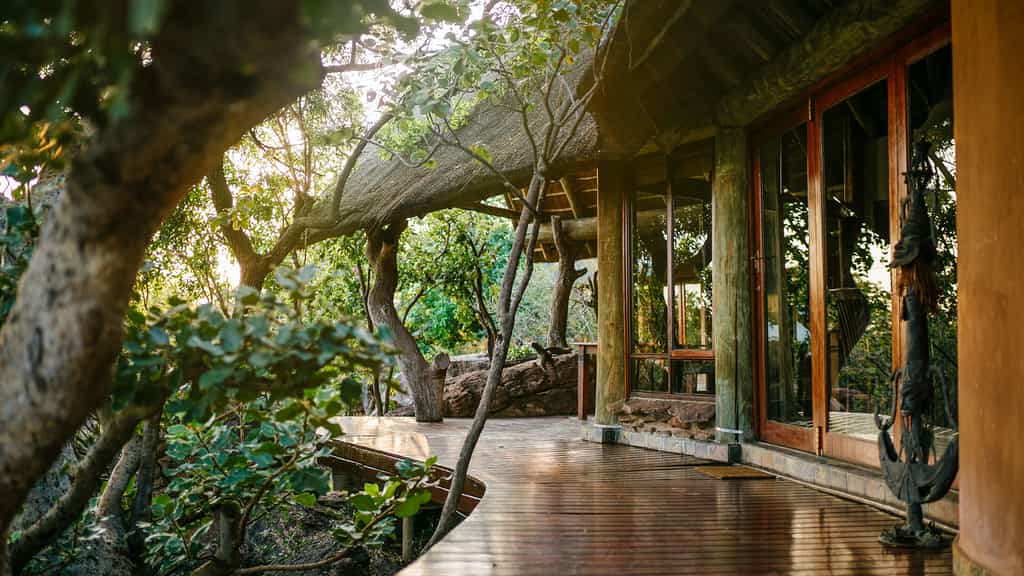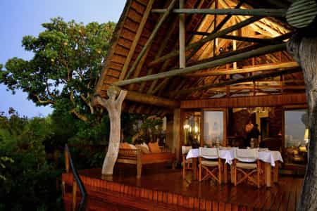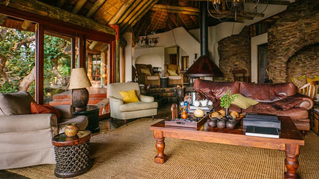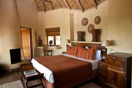 Steeply thatched roofs cover the central bar, dining room and lounge areas. The general atmosphere is warm and homely, especially at the chair-surrounded fire pit, the hub of story telling, with its reassuring crackling glow and silhouettes of the scenery beyond. Outside, a large deck extending from beyond the thatched overhang is perfect for bushwatching; and there's a spa for self-indulgence and a rock pool for cooling down after a game drive.