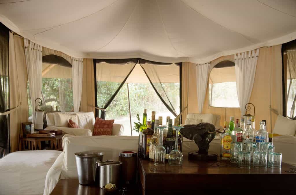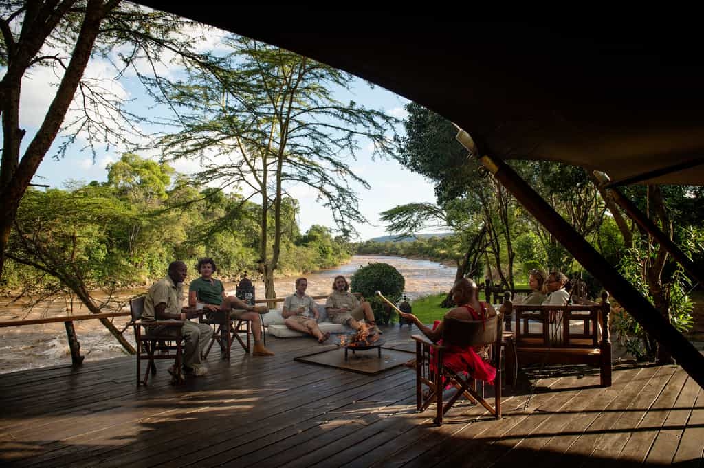 Effortlessly authentic, the mess tent is a tranquil canvas sanctuary perched on the edge of the Mara River, where dark wooden flooring, shimmering hurricane lanterns and swathes of dreamy drapes abound. Cosy up on a sofa and listen to the water tumbling languidly over the rocks and watch the hippo lazing in the sun. Just like a true bush camp, tasty farmhouse cuisine is served up family-style at the grand dining table by easy-going and super-friendly waiters.