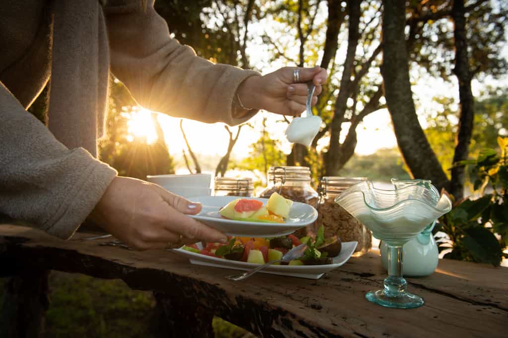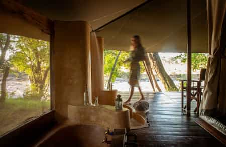 Linked to the mess by a patchwork of trails along the riverbank, the four tents are cavernous and cool and complemented by a pretty palette of creams and khakis. Raised on polished hard-wood platforms, all tents face the river; ask for the canvas to be lowered on three sides to really make the most of view! And the outside bathroom isn’t just a bucket shower – this is the real deal with hot running water, sunken bathtubs and designer His’n’Hers sinks.