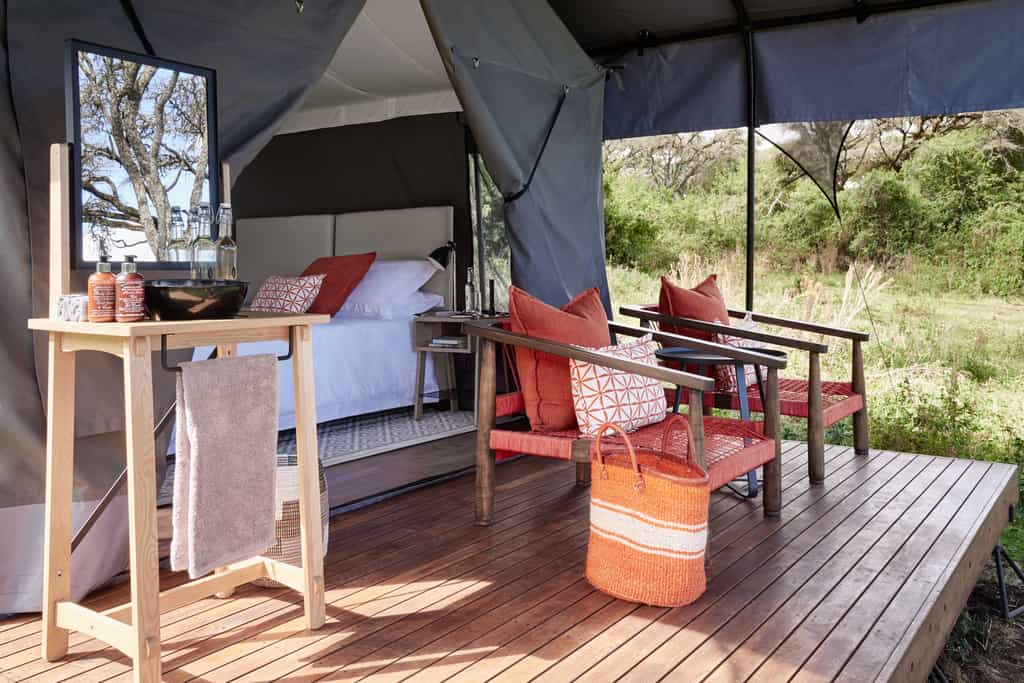 Three Meru-style tents comprise the small, no-frills main area of Sanctuary – a bar, dining tent and lounge. Although simple structures, the tents are luxuriously decorated with billowing fabric ceilings and white table linens. There are comfortable sofas and ottomans, some choice photographs and a few space heaters for chilly evenings. Outdoors is a brightly cushioned seating area with cosy blankets, and meals are served under cover or at private tables scattered at various viewpoints. The food? Delicious and plentiful.