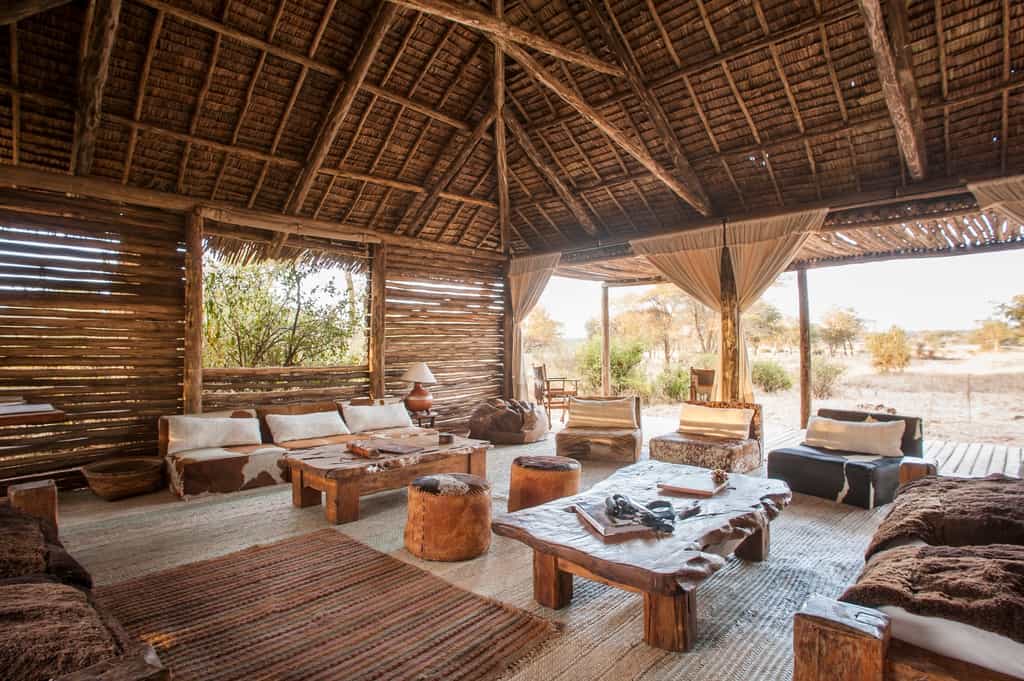 The main area is airy and open-sided and woven from sisal and thatch to create a beautiful, sun-slatted living space. There’s an eclectic mix of furniture including cow skin chairs, leather poufs and sheepskin cushions, and it feels cosy and chic all at the same time. Views of the wilderness are uninterrupted and elephants can often be found ambling around the grass at the front. Dining takes place at round tables illuminated by candle light. Outside the campfire awaits, with stars in the sky and a cold beverage.