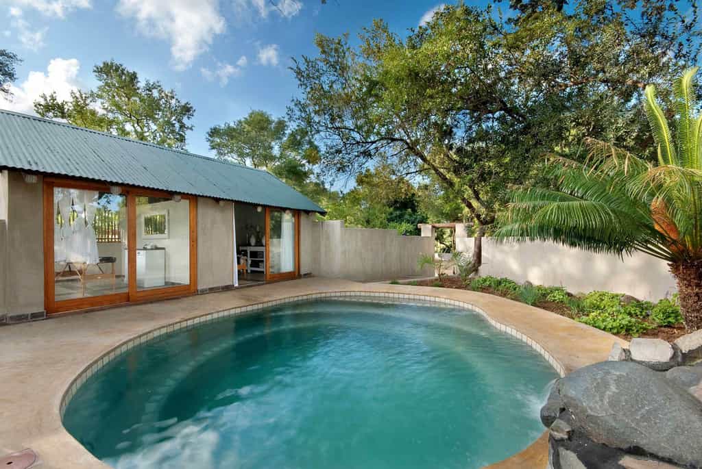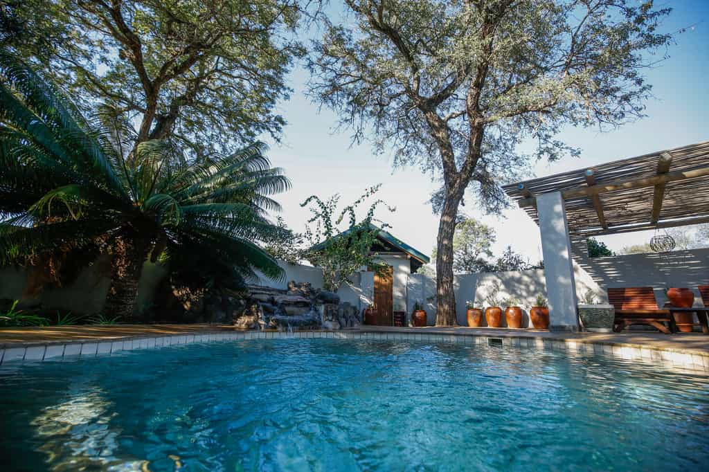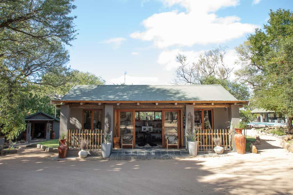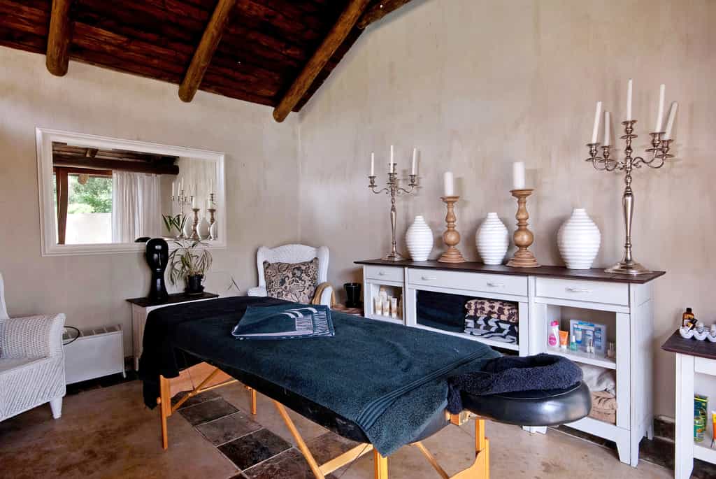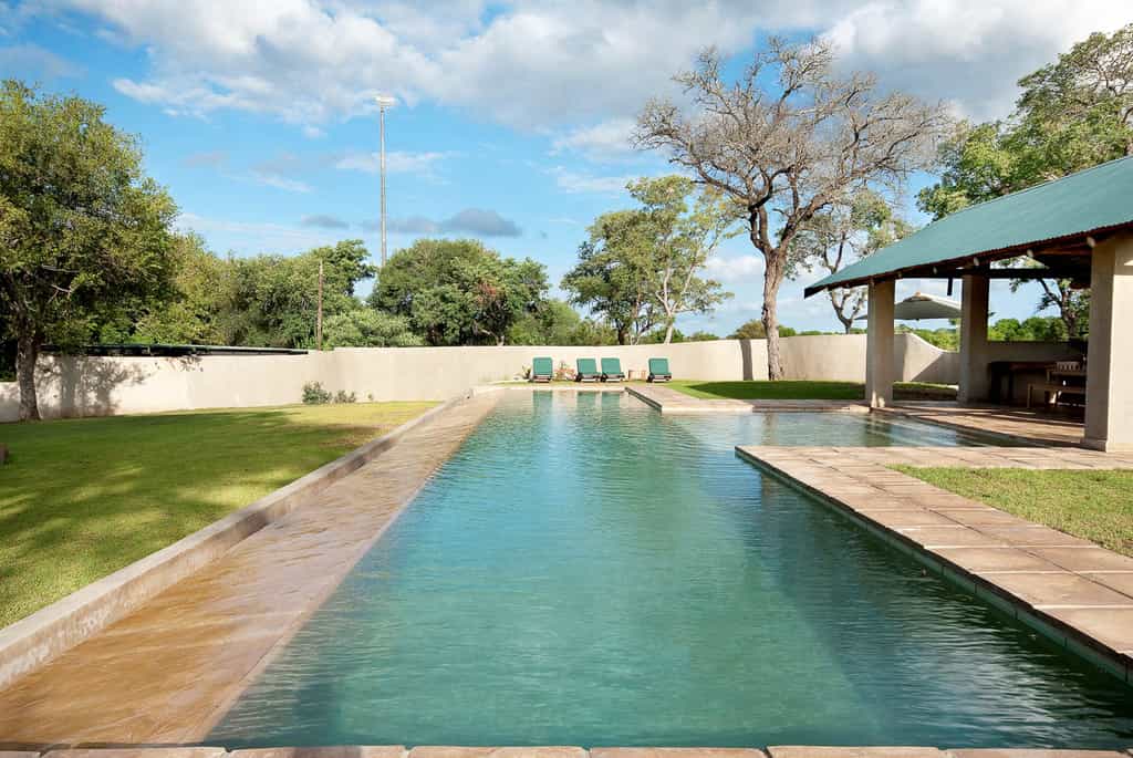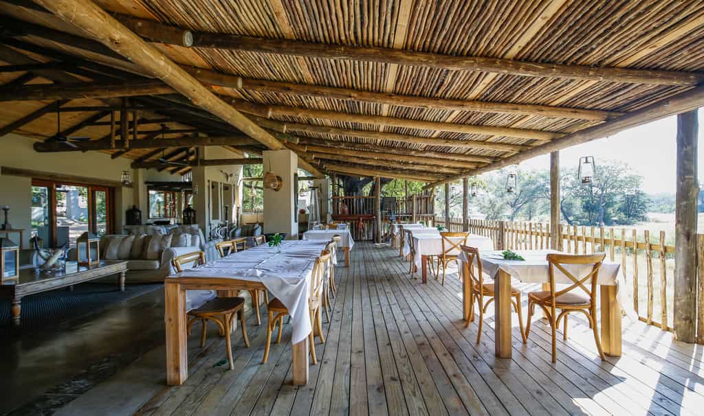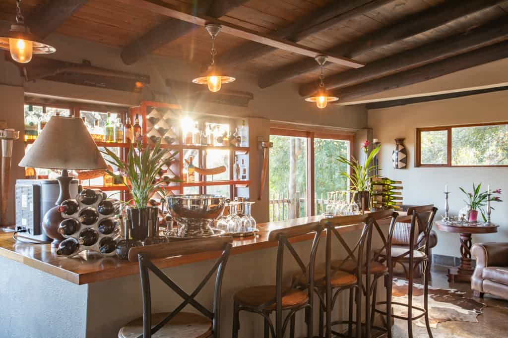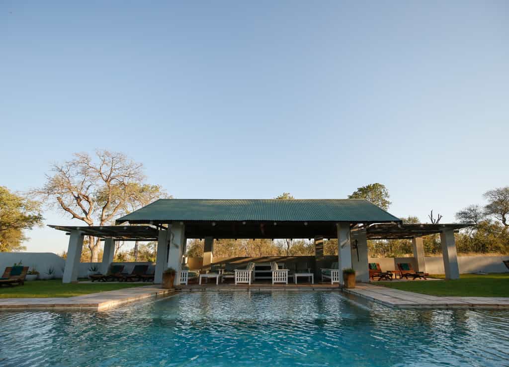 Guests gather in the communal area for meals and to relax. The simple but welcoming internal lounge is furnished with large, soft leather chairs, couches, African sculptures and a large fireplace for chilly winter evenings. Five-star meals are served in the dining area, with views of the surrounding bush. There is also a curio shop, a spa with a private plunge pool and a well-stocked wine cellar. Outside the communal lodge is a fire pit with fold-out chairs and an impressive lap swimming pool.