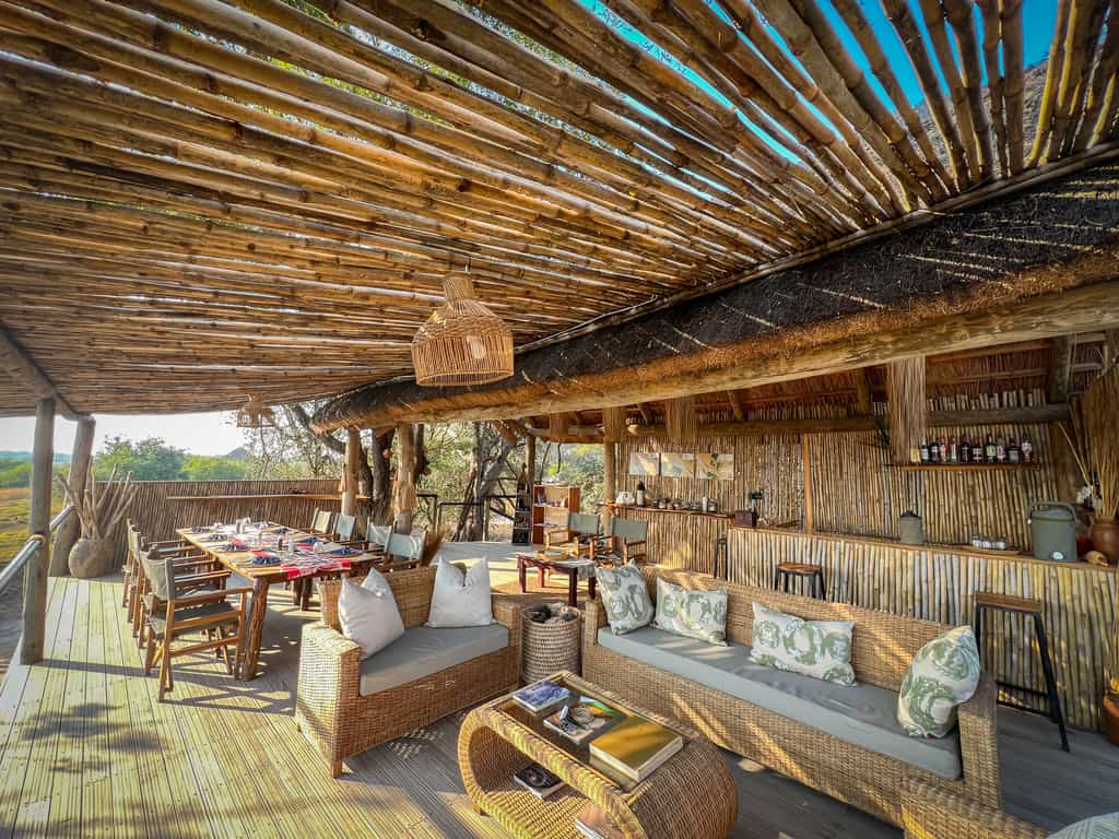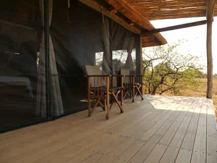 Camp centers around rustic, communal areas, one on a raised deck with prime views over the Busanga Plains (this is where you'll find power points for charging cameras, etc.) and another lower lounge, which is kept shaded by stretched canvas - perfect for reclining away from the noon heat. There is a refrigerator for cold drinks, which feels like a top-tier luxury out here, but is nonetheless a welcomed extravagance.