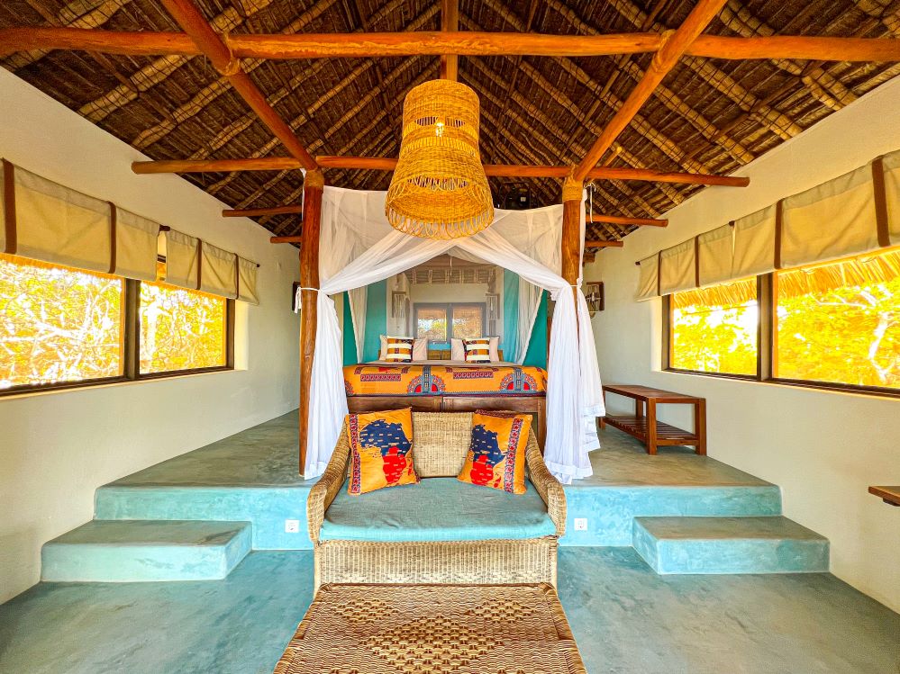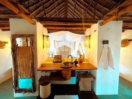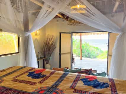 Ten double chalets and two family cottages are dispersed along 2km of beachfront within the dune forest. Each is just steps from the beach and uniquely decorated with bright Mozambican textiles in electric greens and magenta pinks. Constructed almost entirely of local materials by local craftsmen, the chalets radiate a rustic elegance that puts them a notch above your typical beach bungalow. With wrap-around decks, split-level bedrooms and wide double doors, it's clear that much care has been taken in their design. All cottages have open-plan, en-suite bathrooms with a vanity and basin, an indoor and alfresco shower, as well as a no-flush eco-toilet which is incredibly environmentally efficient and unsmelly. The family cottages have space for two extra beds.